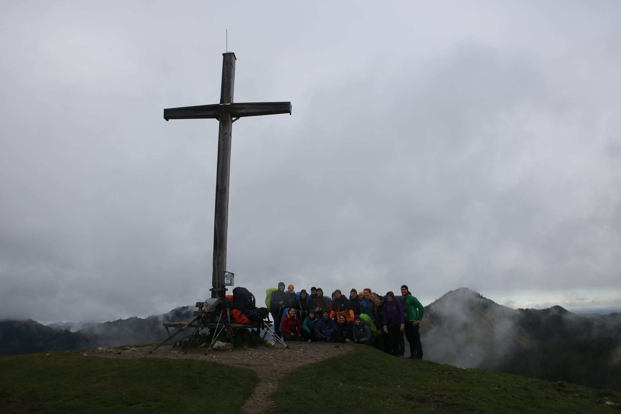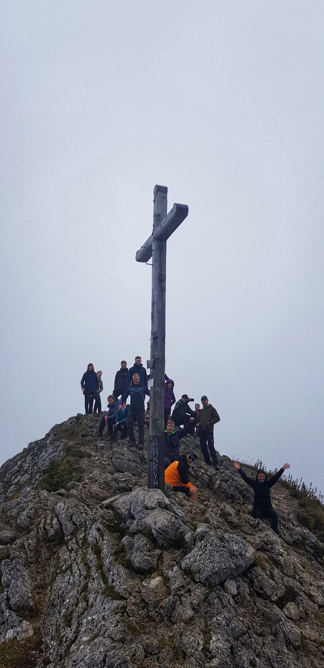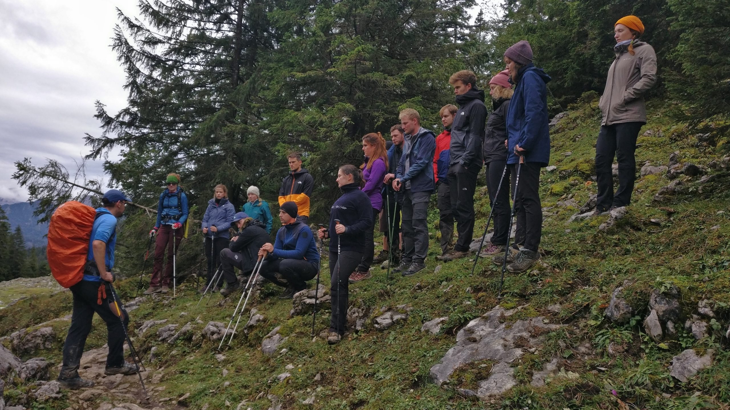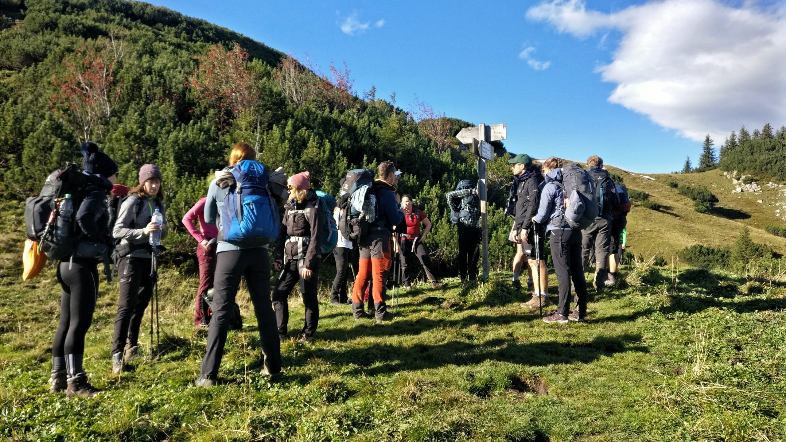 Der erste Teil des Weges führt uns durch ein schönes Waldstück und dabei die Skipiste vermeidend hinauf bis zur Schönfeldhütte (1410 m). Die große Gruppe der Wanderenthusiasten erklimmt als ersten Gipfel der Tour zusammen den Taubenstein (1692 m), wo die obersten Höhenmeter mit Drahtseil versichert sind. Nach dem Gipfelerlebnis geht es bei langsam aber stetig zunehmender Bewölkung weiter unterhalb der Lampersbergwand zum Rotwandhaus (1737 m), wo wir gerade rechtzeitig vor dem Regenschauer ankommen.