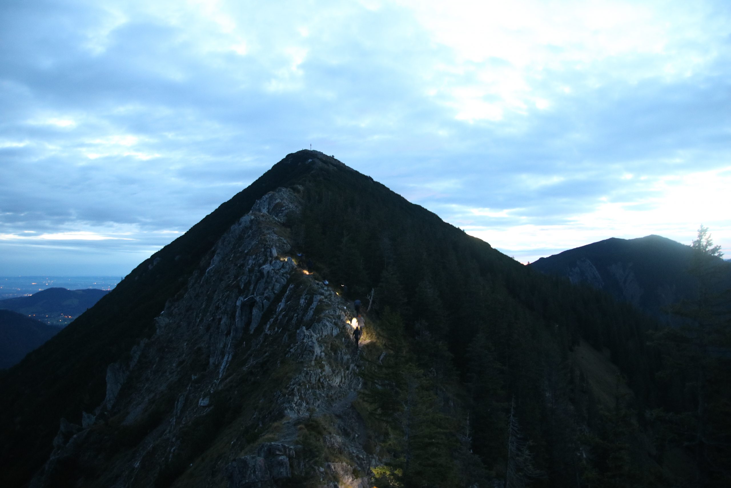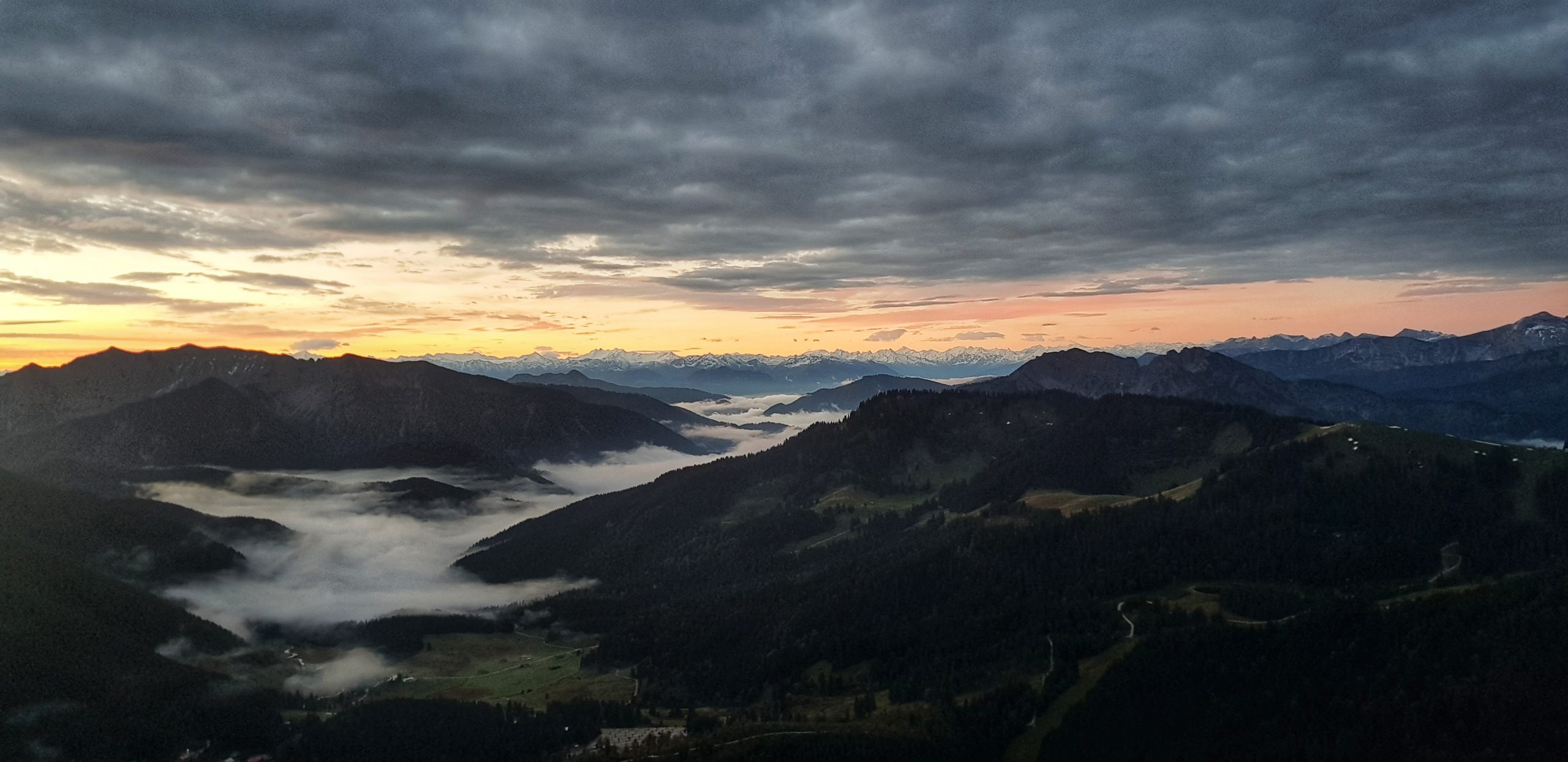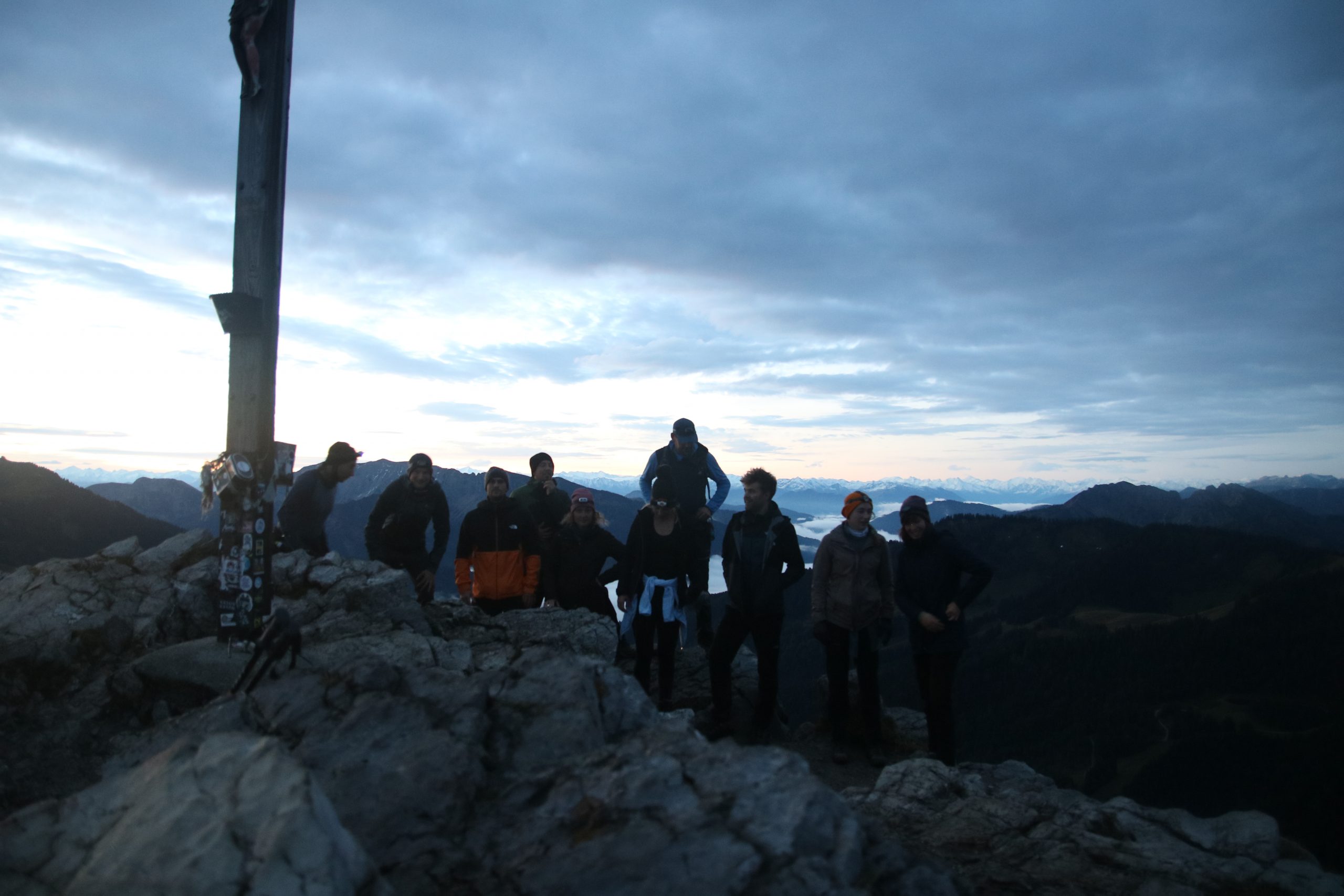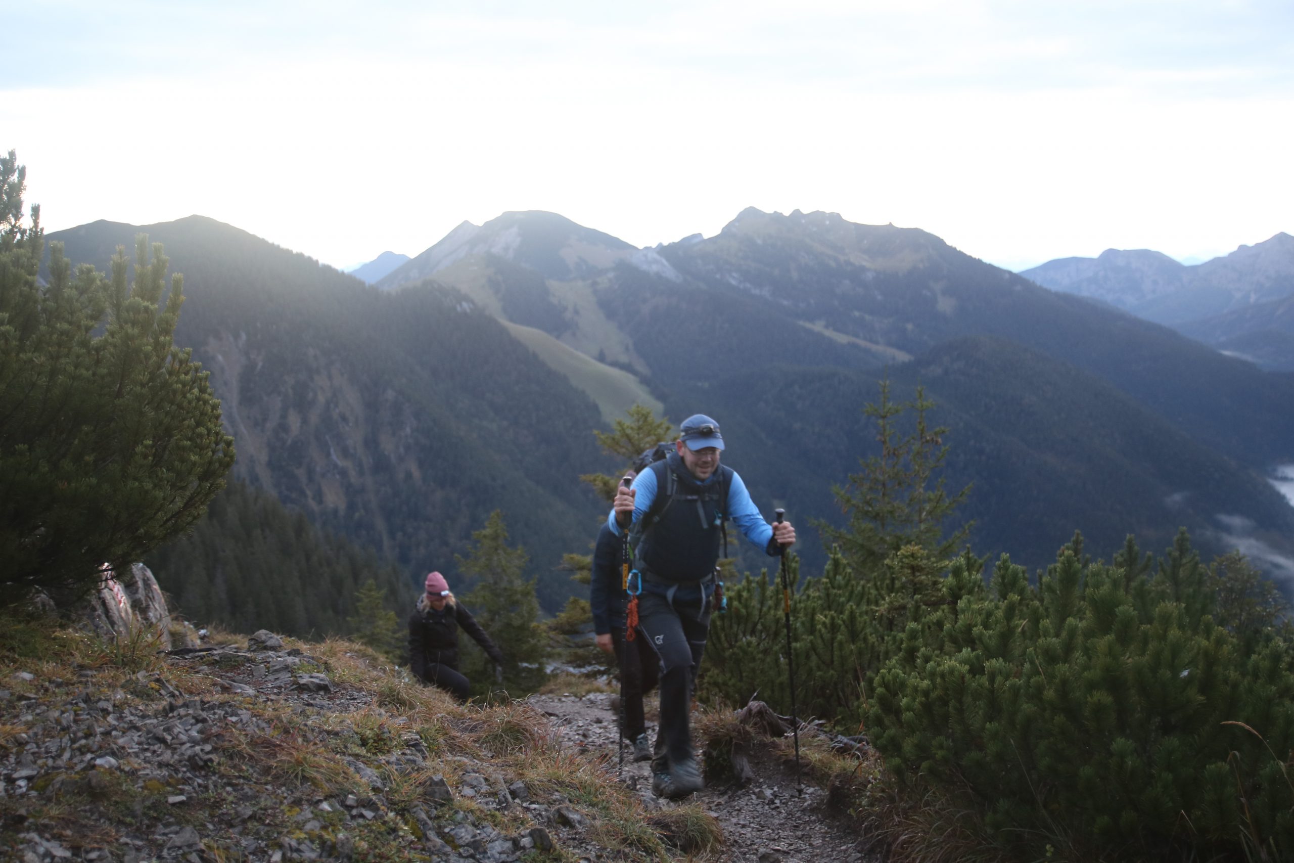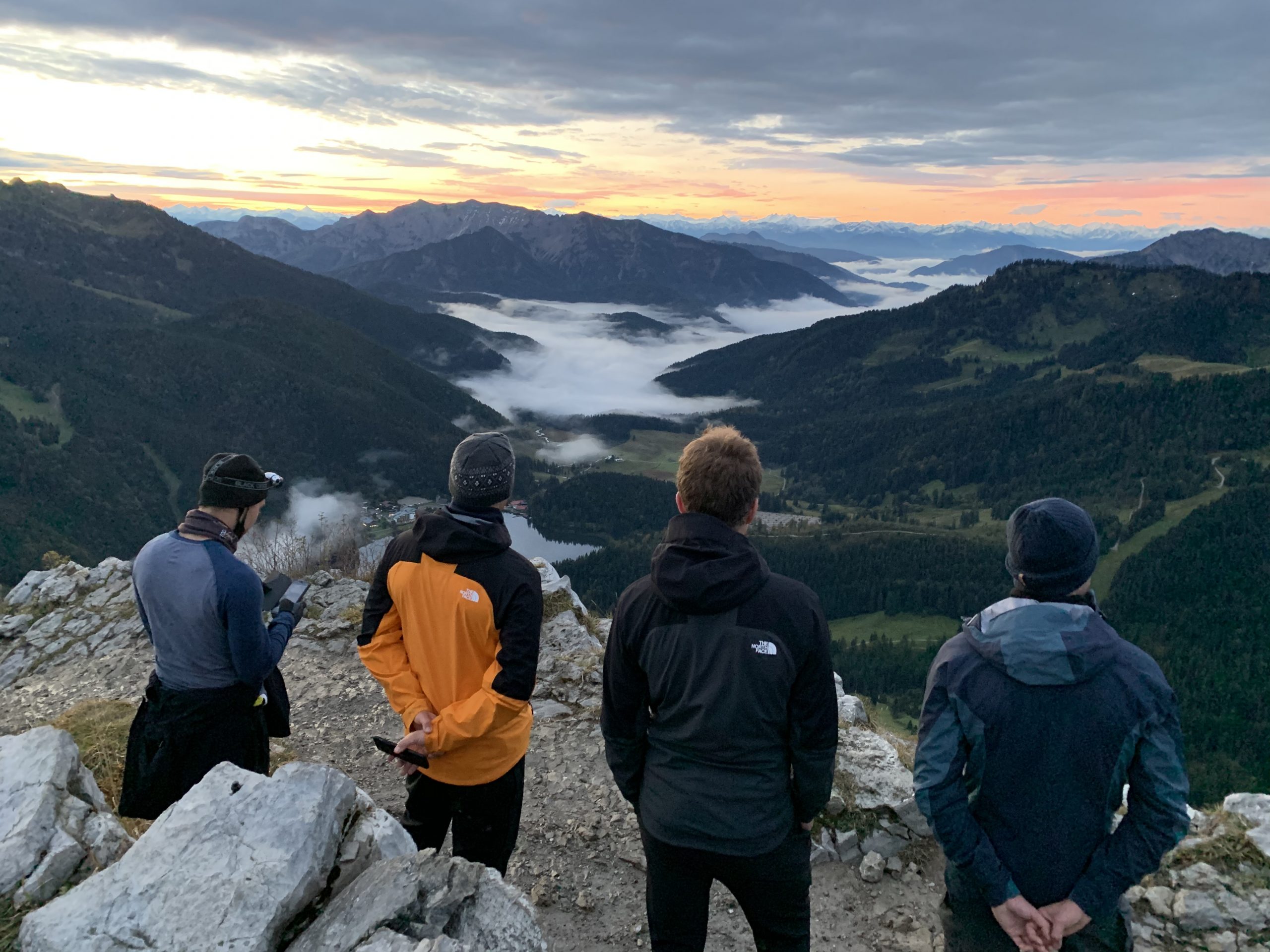Für eine weitere Sonnenaufgangstour schließt sich ungefähr die Hälfte der Gruppe an, um die Brecherspitz (1683 m) mit den Stirnlampen zu erklimmen. Teil der Bergtour sind auch gelegentliche, drahtseilversicherte Passagen, die die gesamte Gruppe mit Bravour meistert. Oben angekommen ist der Ausblick auf die talnahen Nebel und das Panorama der umliegenden Seen im Farbenspiel des Sonnenaufgangs wahrlich grandios.