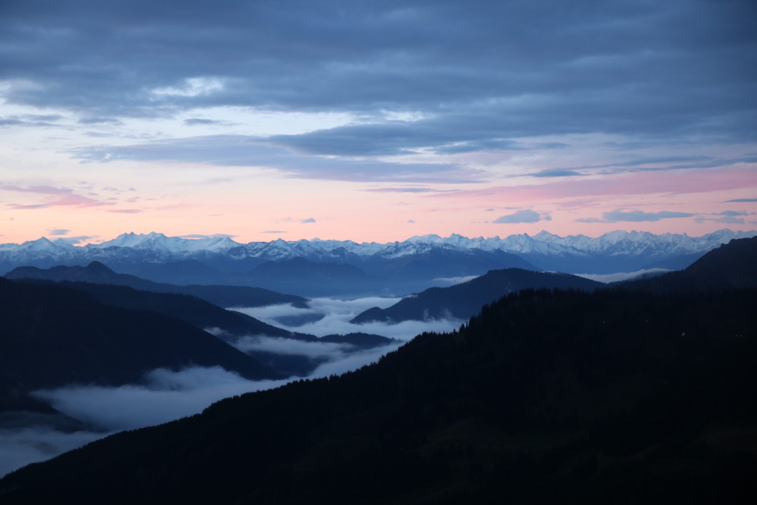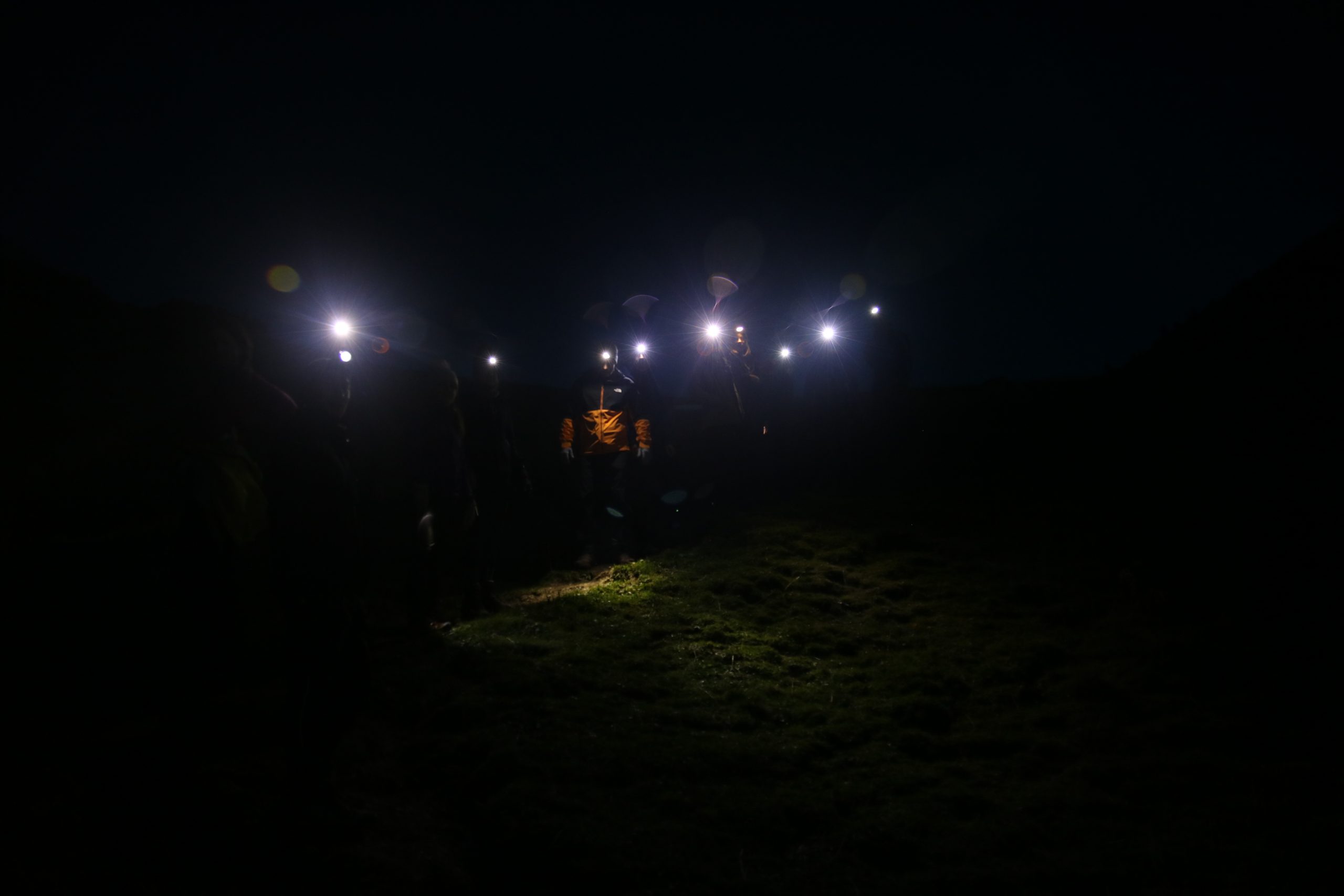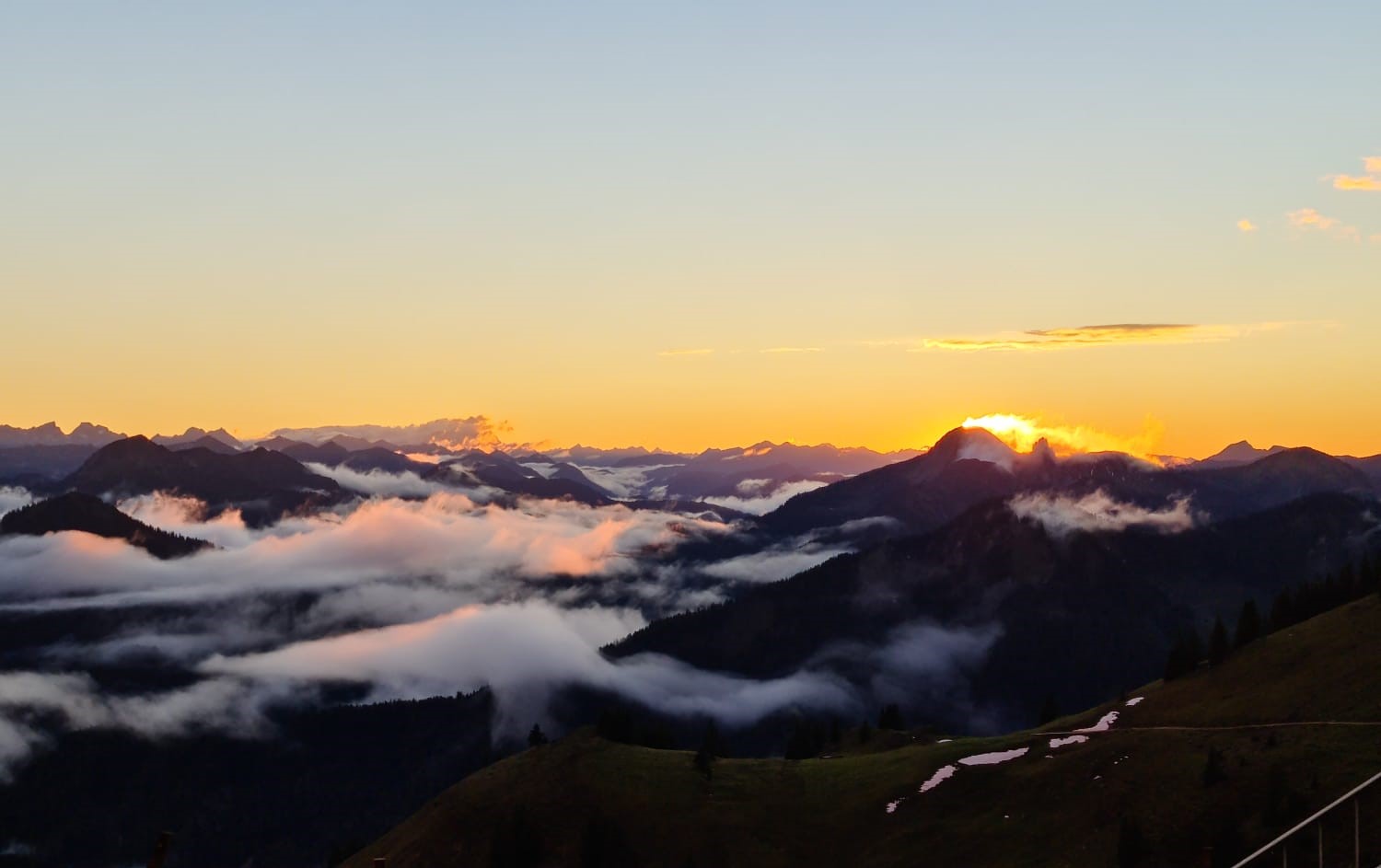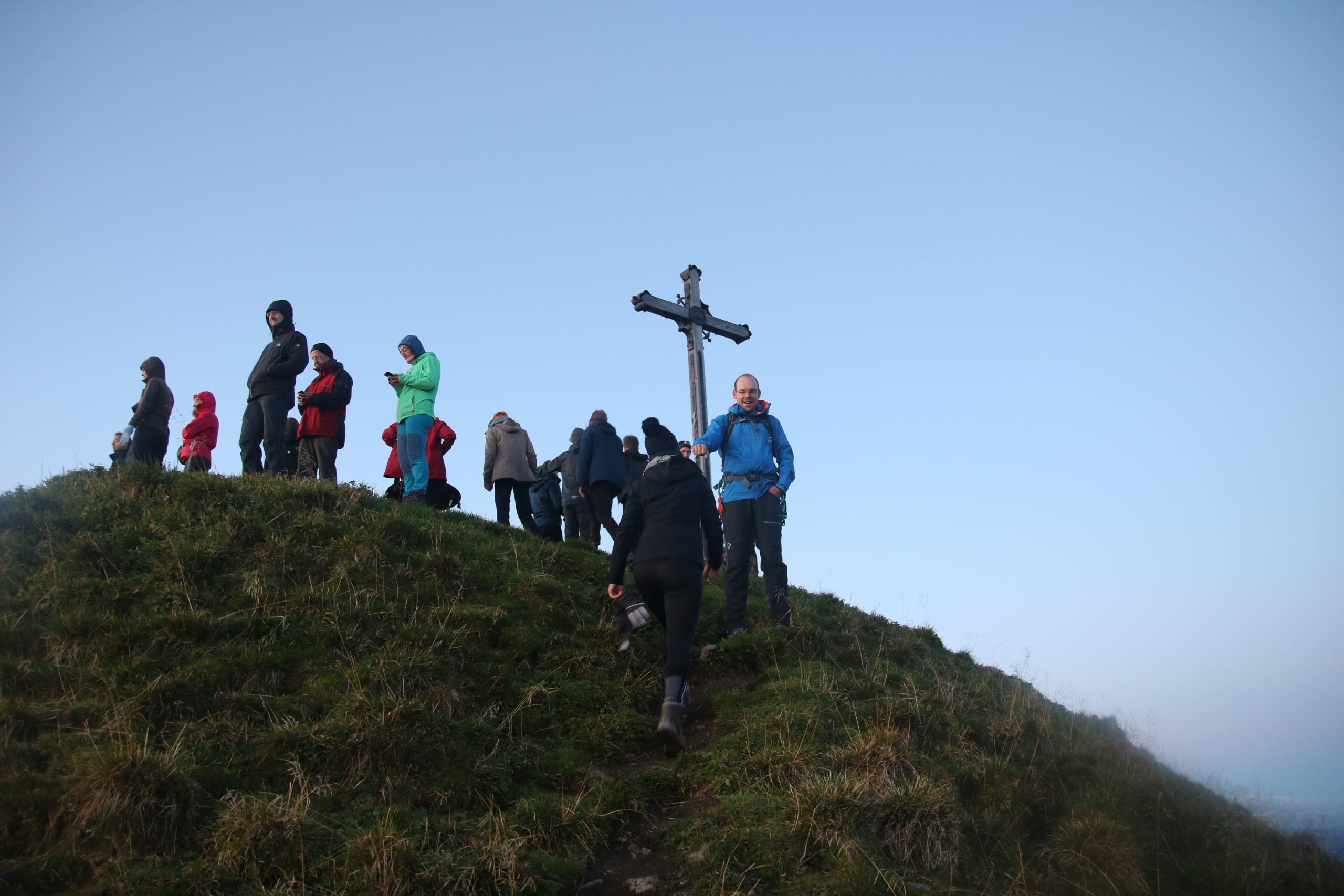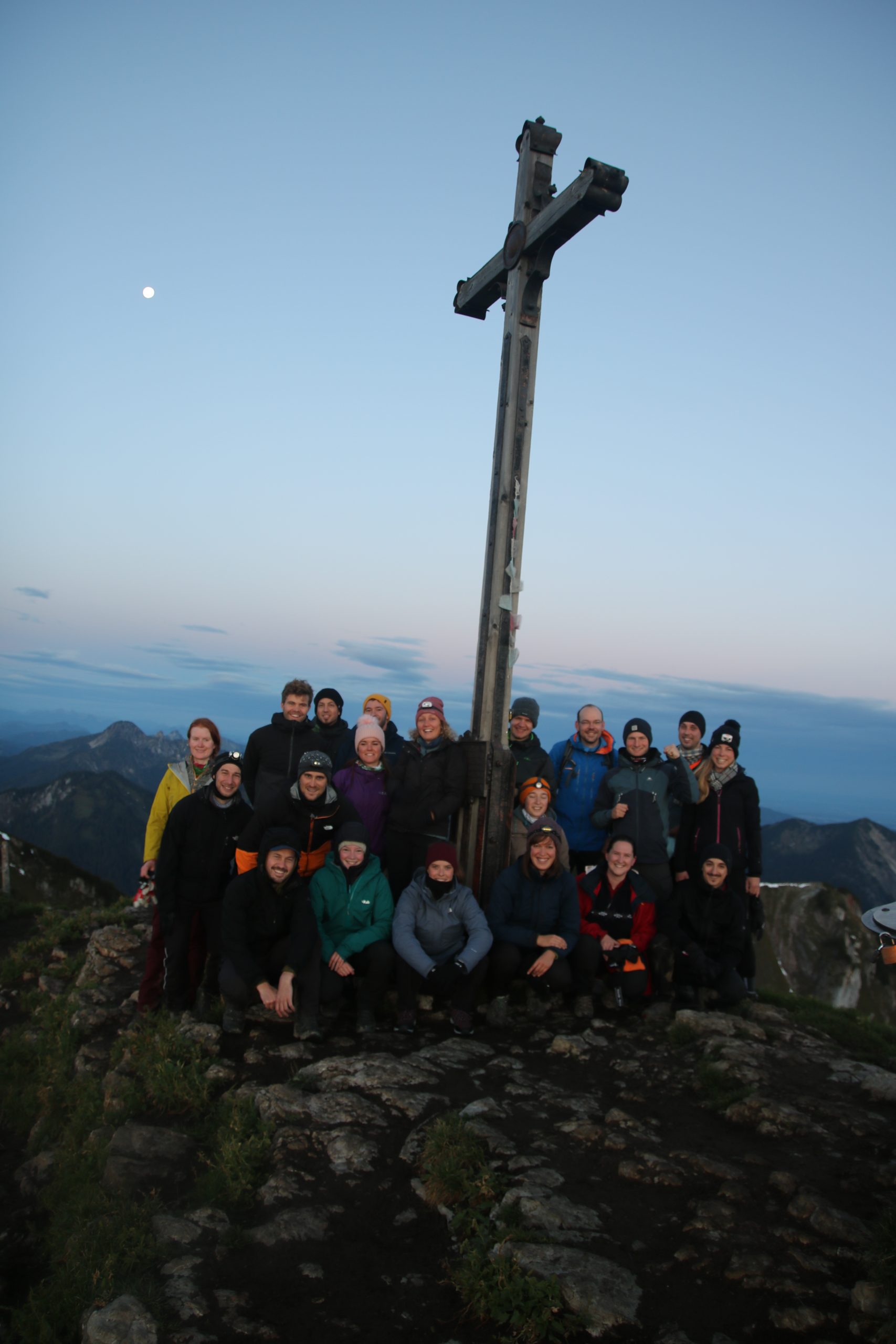Für eine weitere Sonnenaufgangstour schließt sich ungefähr die Hälfte der Gruppe an, um die Brecherspitz (1683 m) mit den Stirnlampen zu erklimmen. Teil der Bergtour sind auch gelegentliche, drahtseilversicherte Passagen, die die gesamte Gruppe mit Bravour meistert. Oben angekommen ist der Ausblick auf die talnahen Nebel und das Panorama der umliegenden Seen im Farbenspiel des Sonnenaufgangs wahrlich grandios.