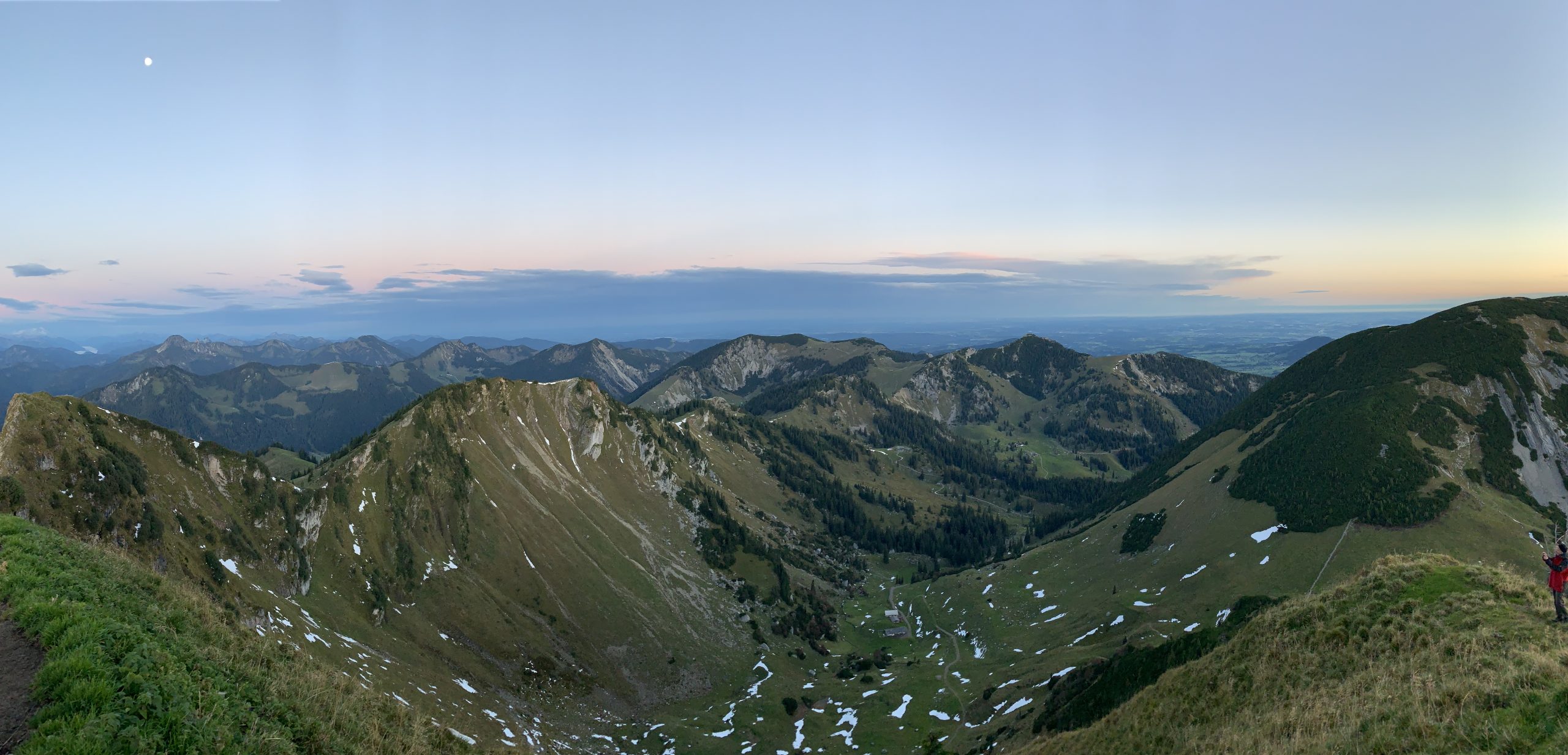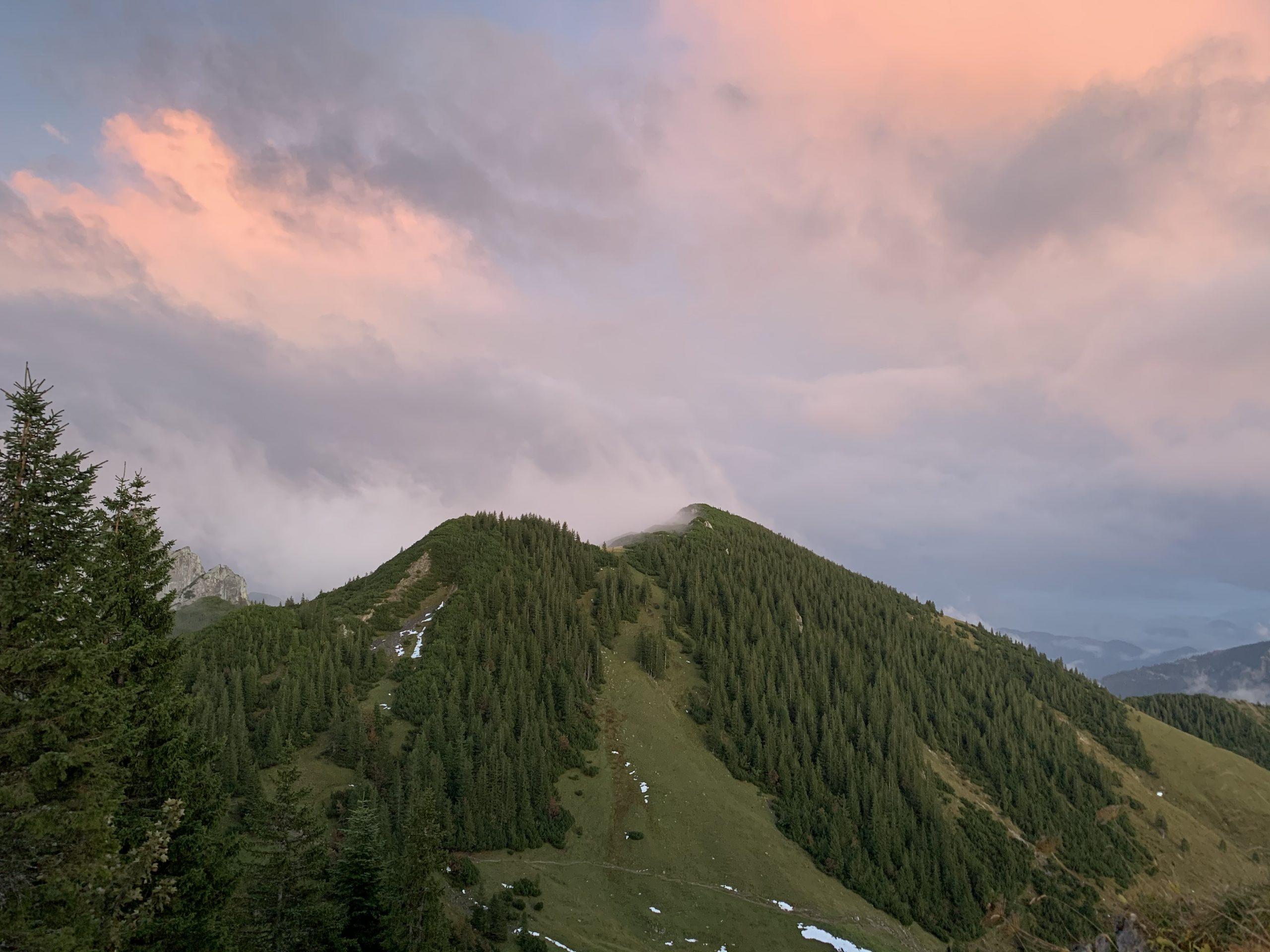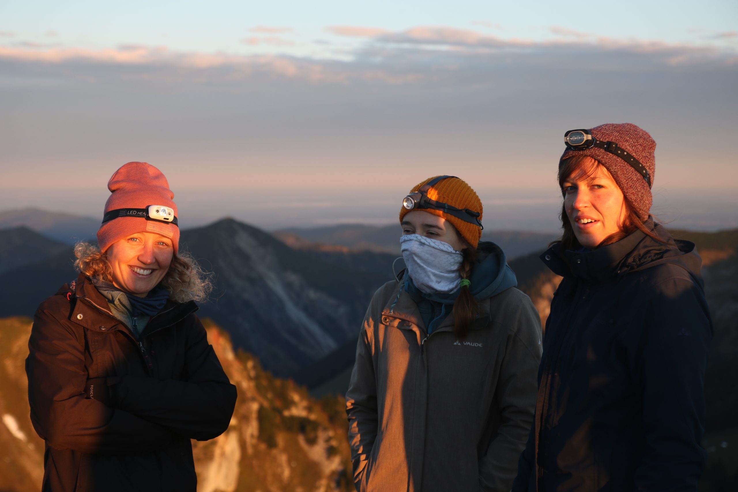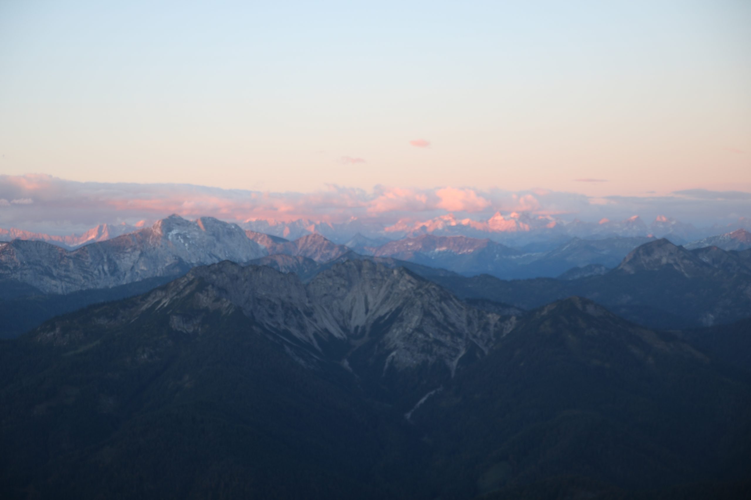 Für den Start des zweiten Tages gibt es mehrere Optionen für eine Sonnenaufgangstour. Während eine Gruppe den direktesten und entspanntesten Anstieg zur Rotwand (1884 m) wählt, geht die Gruppe, die etwas eher aufgestanden ist, in völliger Dunkelheit und lediglich im Schein der Stirnlampen am Fuße der Rotwand herum und steigt vom Miesingsattel (1703 m) aus durch zahlreiche labyrinthartige Latschen hinauf zur Rotwand (1884 m). Oben angekommen bietet sich uns ein wunderbarer Sonnenaufgang mit herrlichem Blick vom nahen Alpenvorland bis hin zu den österreichischen und südtiroler Alpengipfeln. Zurück am Rotwandhaus schmeckt das Frühstück nach einer kleinen Sonnenaufgangstour auch gleich doppelt so gut!