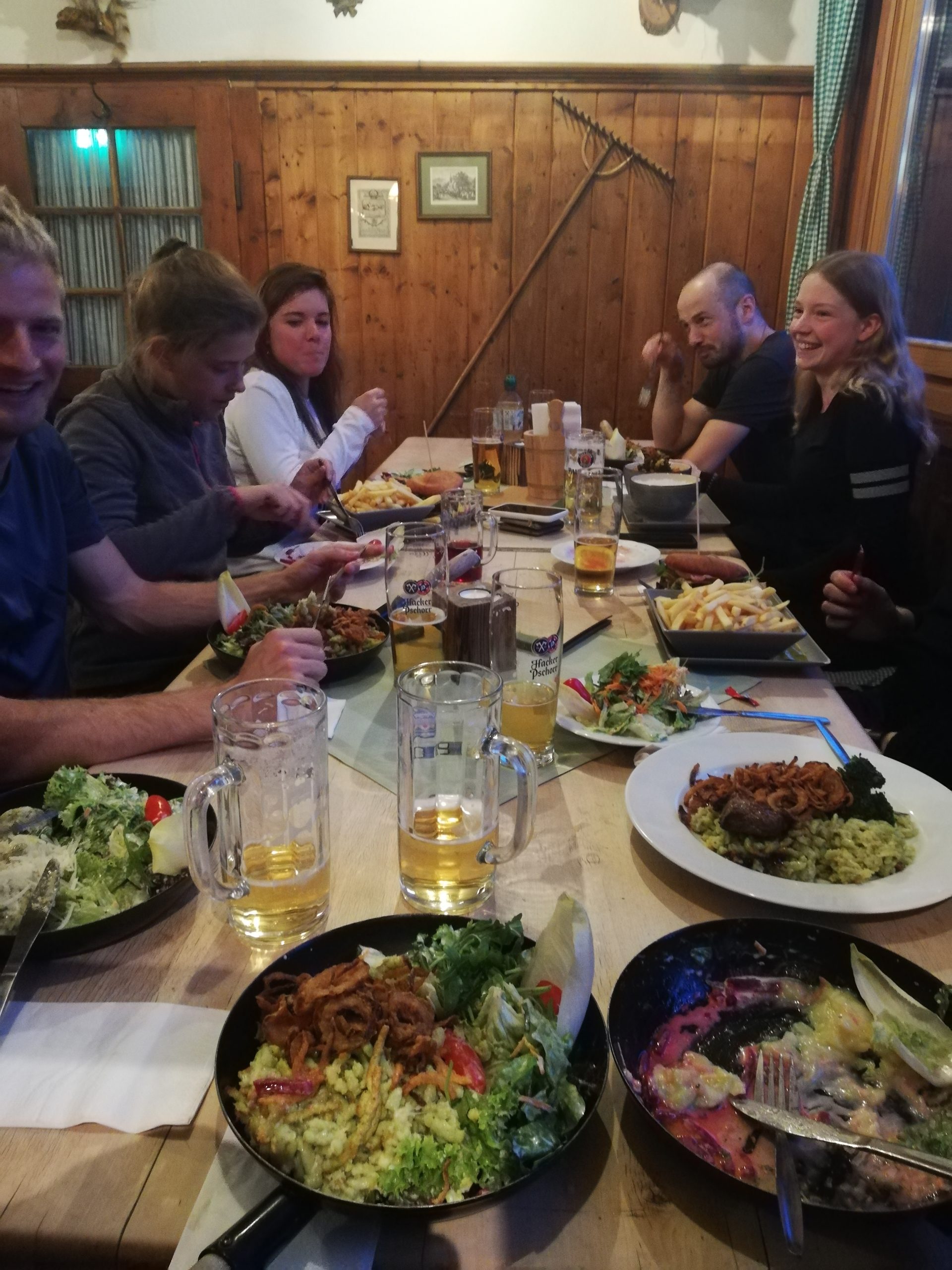 Fast die gesamte Gruppe entscheidet sich nach der Mittagspause für einen Bonusgipfel und wir gehen gemeinsam über den ansprechend-felsigen Nordanstieg zum Bodenschneid (1668 m) hinauf und den Bogen ziehend pünktlich zum Abendessen zurück auf die Obere Firstalm. Die Essensportionen sind wahrhaft gewaltig und schmackhaft!