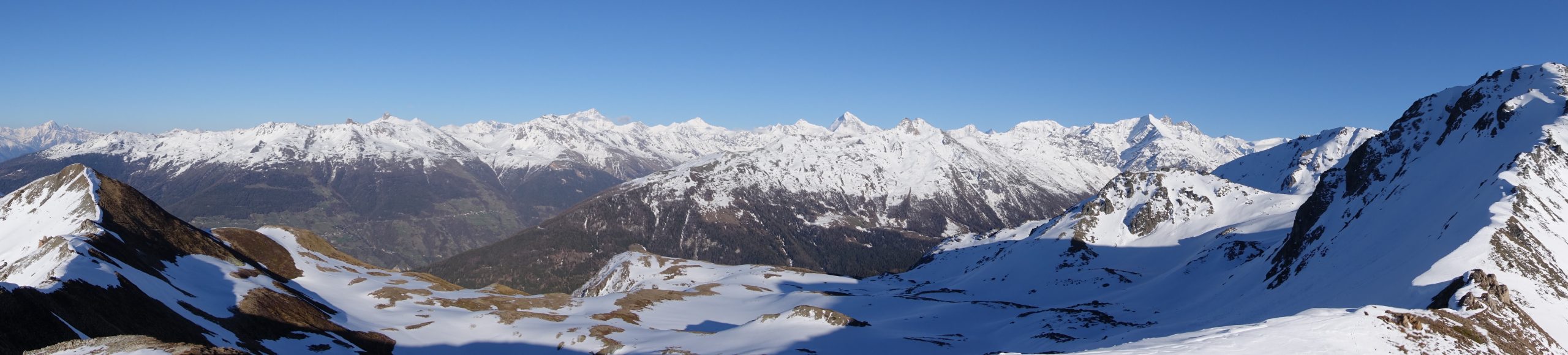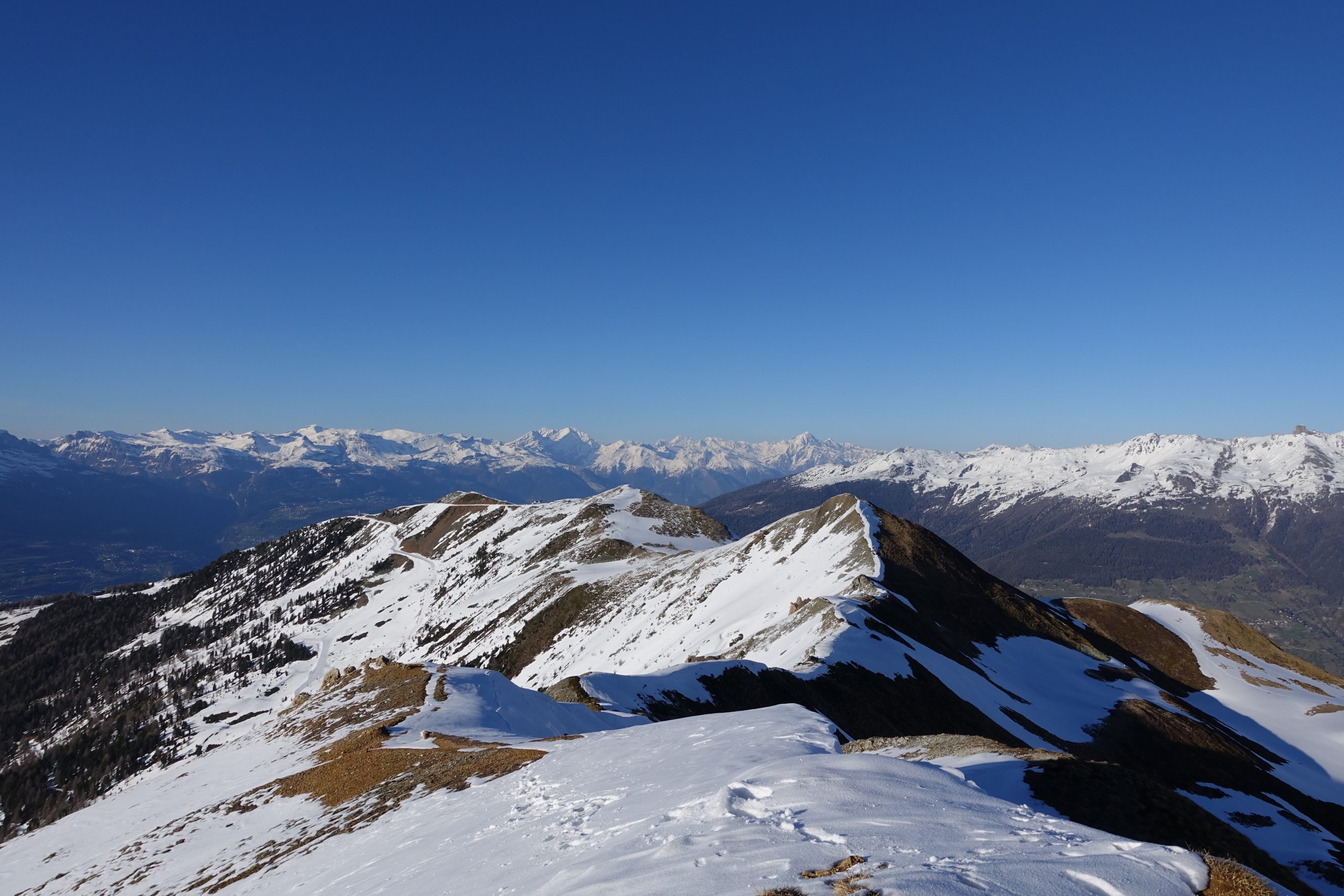 Die erste Tour führt uns auf der Ostseite des Bergrückens auf einem schönen Pfad langsam aufsteigend hinauf, danach steiler ansteigend weiter bis „La Grand-Tsa“ und schließlich zum Mont Carré (2469 m). Von diesem bereits beeindruckenden Vorgipfel geht es weiter über den schneebedeckten Grat zum Mont Rogue (2491 m), der eine herrliche Aussicht zu den schönsten 4000ern des Wallis bietet! Nach einer verdienten Gipfelrast geht es zurück zum Mont Carré (2469 m) und dann den Aufstiegsweg rechts liegen lassen weiter über den Gratweg bis zur Station La Tsermetta (2413 m). Von dort aus geht es mit viel Schwung und Freude dann direttissima und immer mal wieder den Schnee testend zurück nach Les Collons.