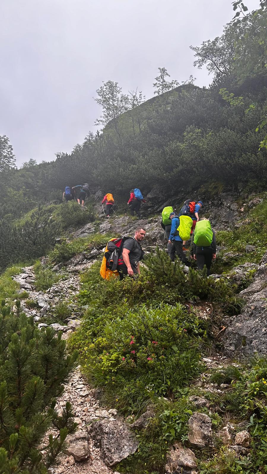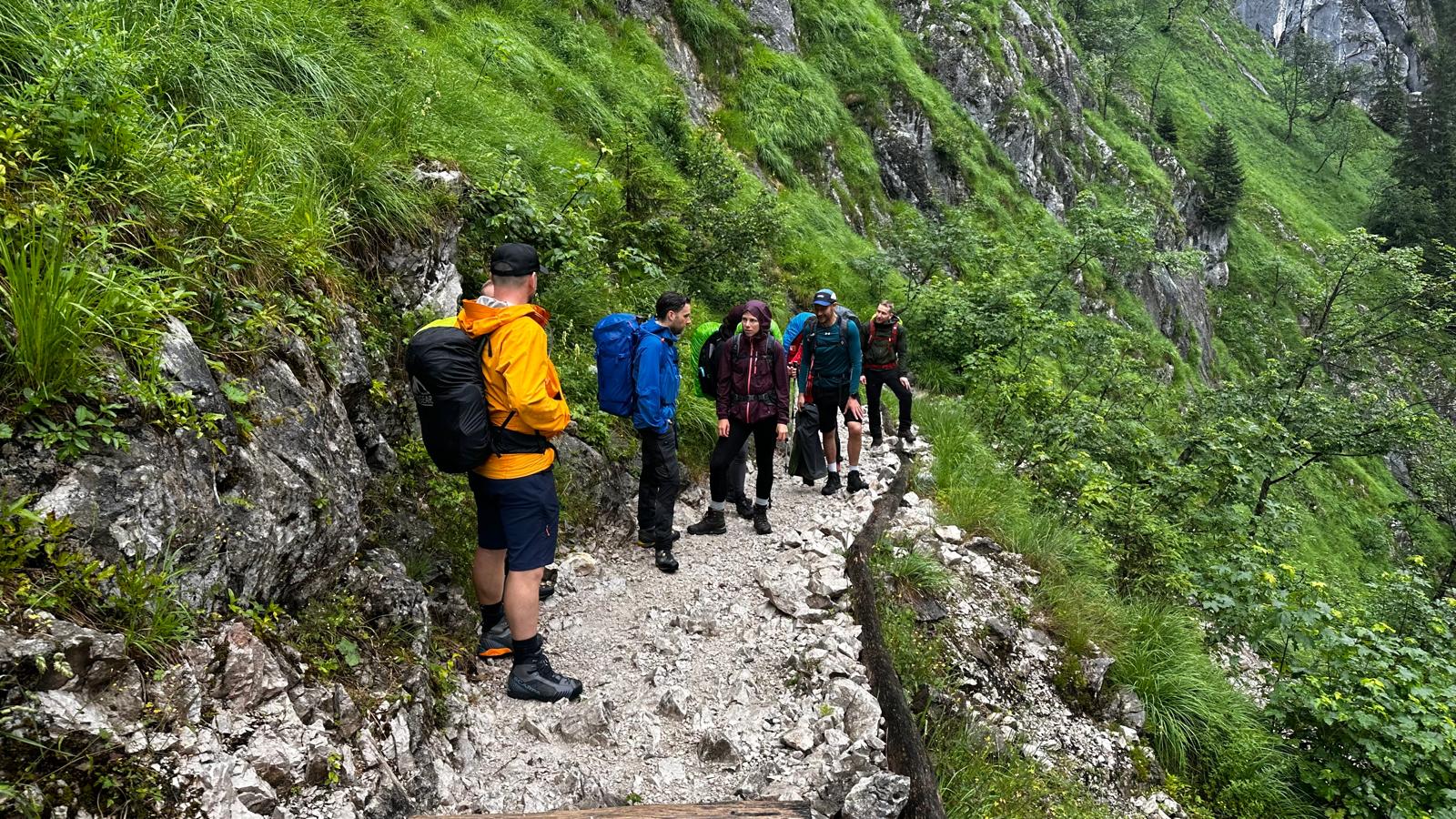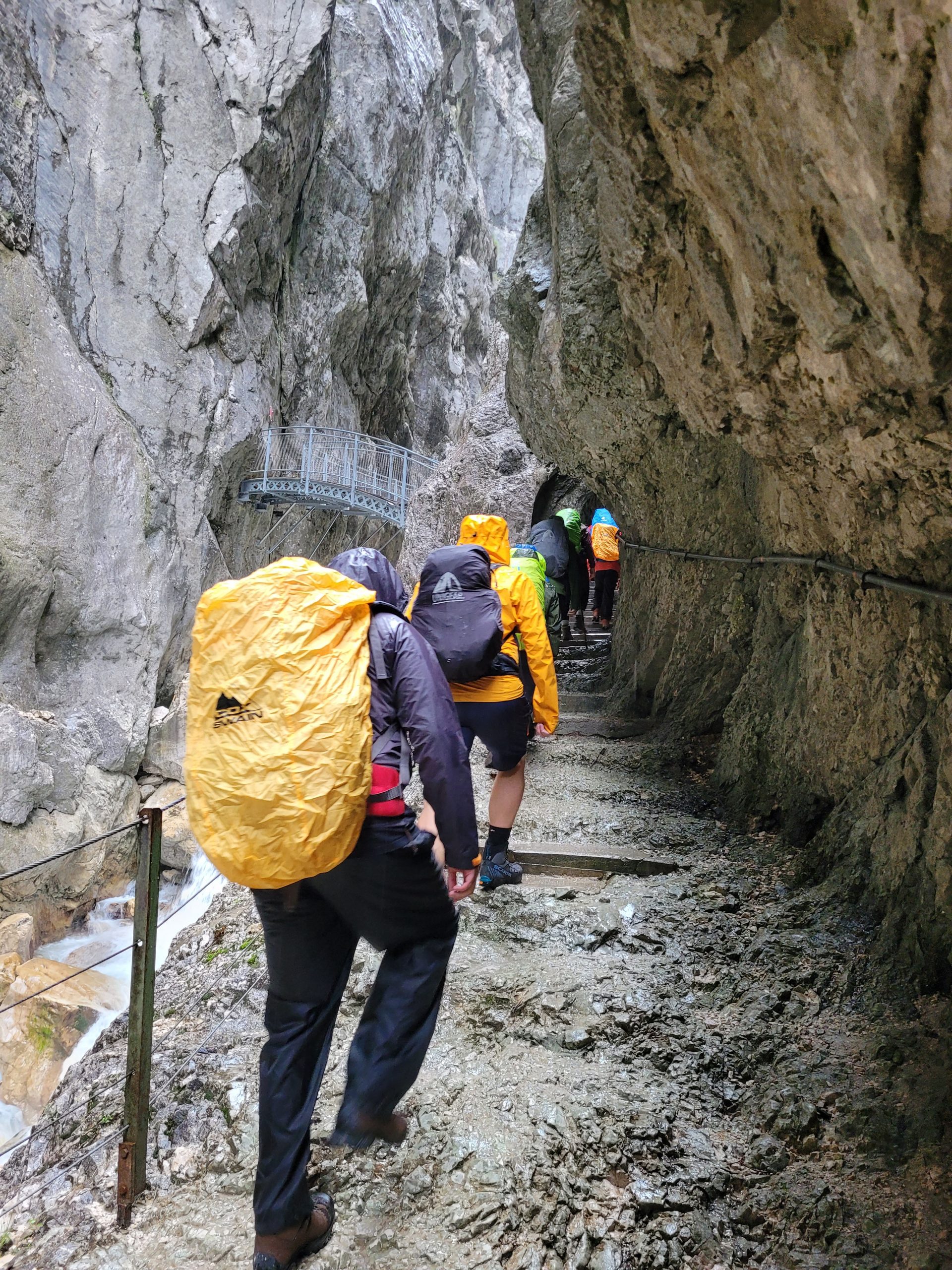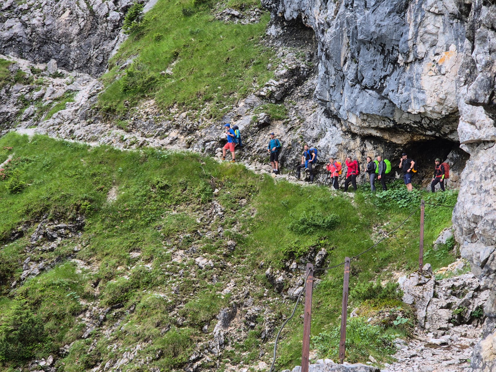 Wir starten unsere viertägige Tour mit der Zugspitzbahn von Garmisch Partenkirchen nach Hammersbach und nutzen das Haltehäuschen direkt um die Regenklamotten überzuwerfen. Im mittel-leichten Regen geht es danach zur Höllentaleingangshütte und durch die beeindruckende Höllentalklamm, deren Erschließung für Wanderer maßgeblich von Adolf Zöppritz ab 1902 bis zur Fertigstellung 1905 vorangetrieben wurde. Aufgrund der Wetterlage sind wir dankbar für eine Einkehr in der neuen Höllentalangerhütte (1387 m), wo wir ausgiebig speisen sowie trinken und die Zeit auch gleich für eine amüsante Vorstellungsrunde nutzen. Es geht bei wechselhaftem Wetter zu Fuß weiter über die Knappenhäuser (1526 m) an den deutschen Molybdänstollen zum Hupfleitenjoch (1750 m). Von dort genießen wir dank deutlich verbessertem Wetter einen spektakulären Blick zurück ins Höllental und auf die Hauptgipfel des Wettersteinmassivs. Deutlich beschwingt gehen wir weiter zum Adolf Zöppritz Haus bzw. Kreuzeckhaus (1850 m) und lassen uns bei Kaffee und Kuchen die Klamotten von der Sonne trocknen.