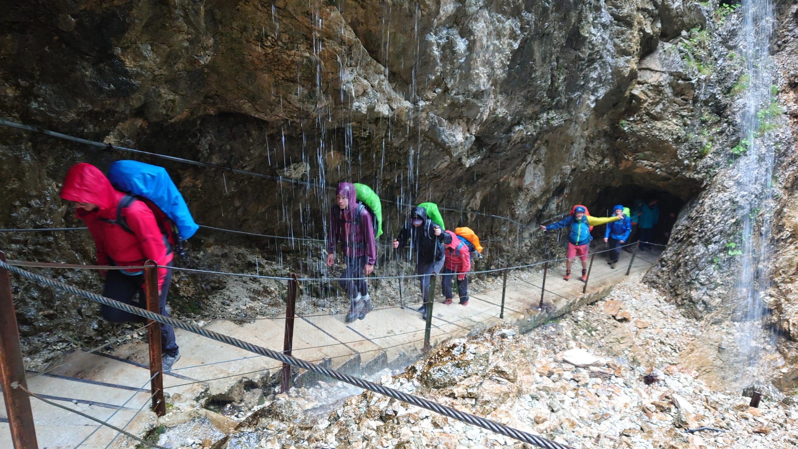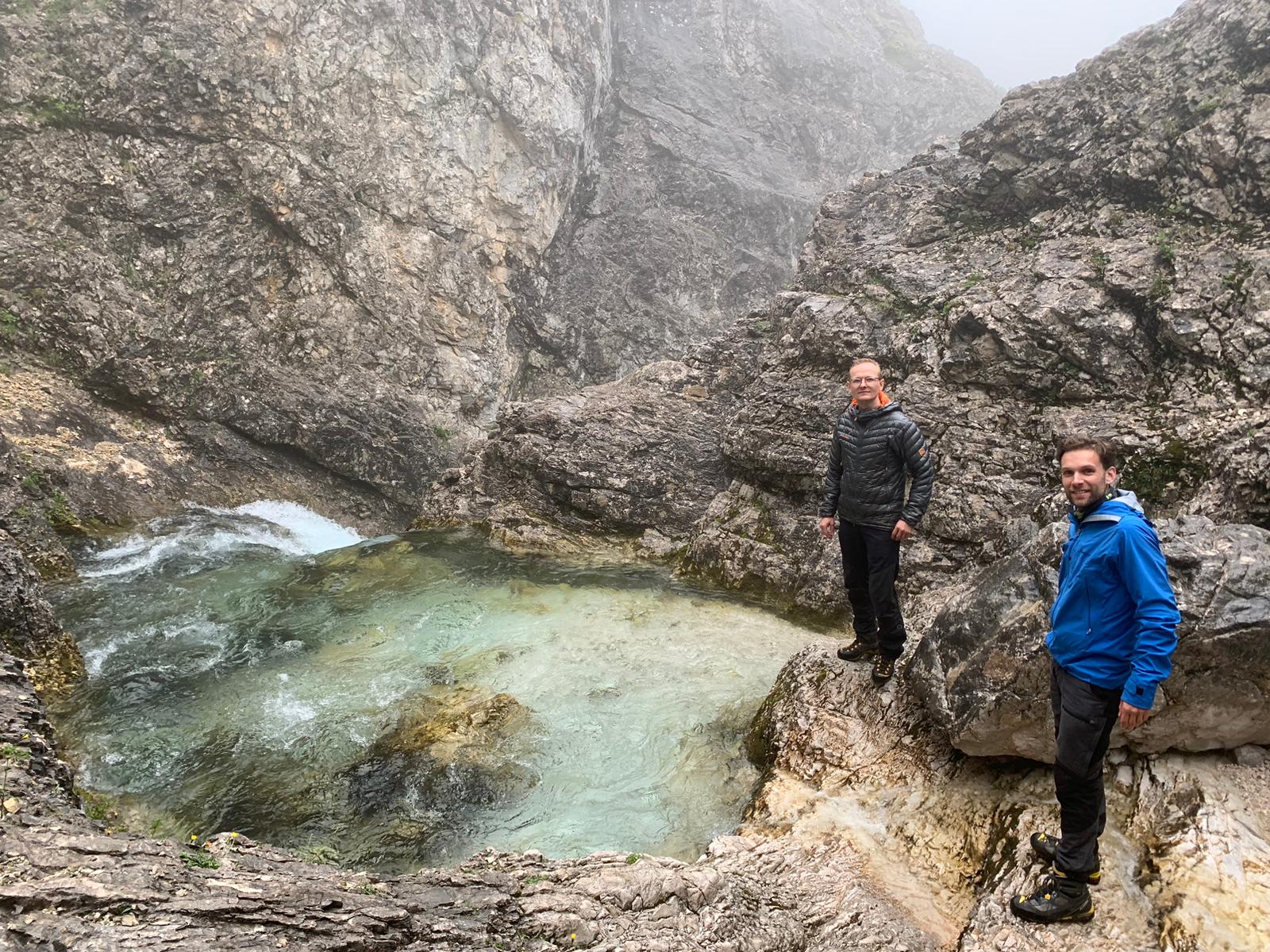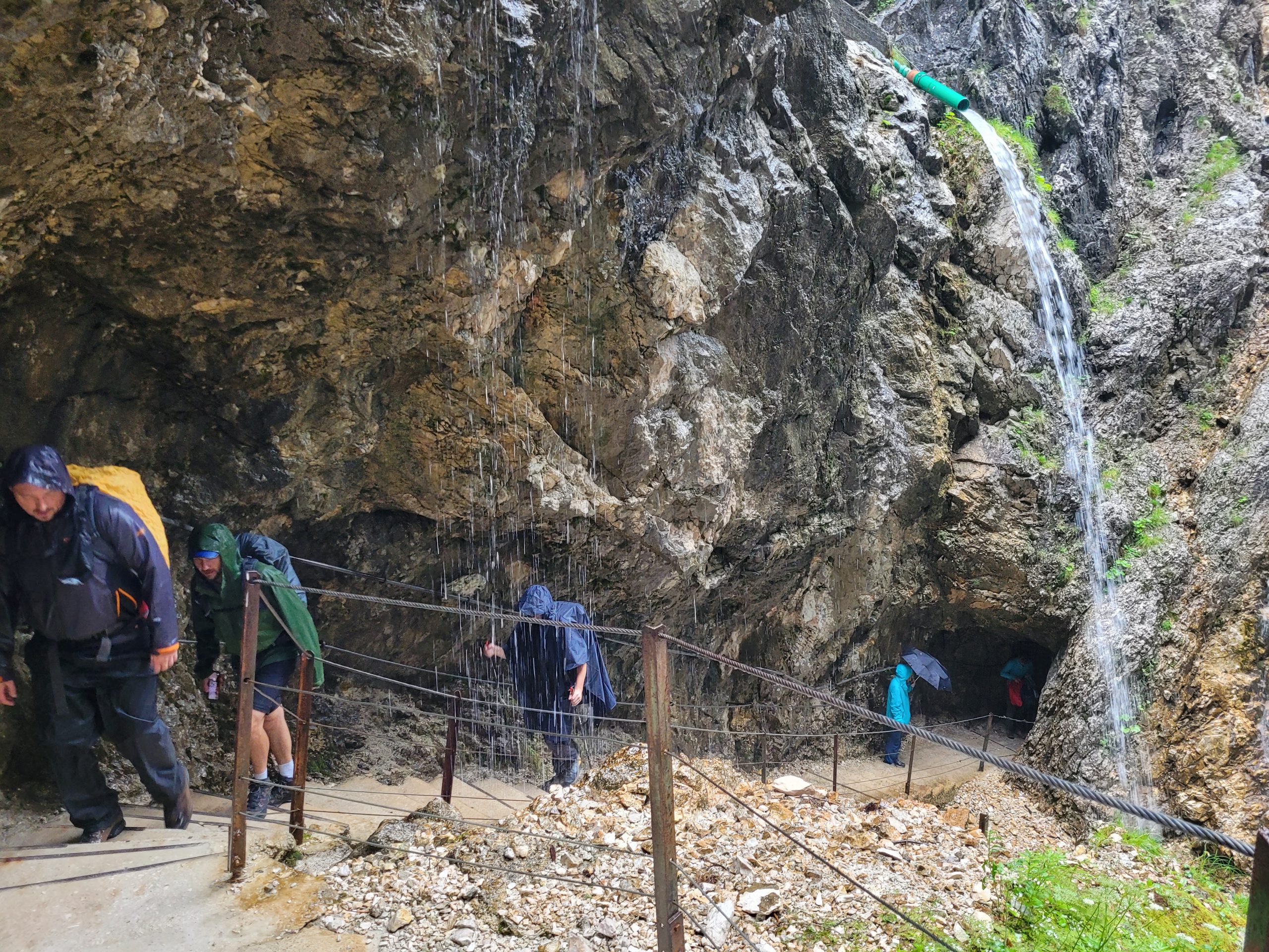 Wir starten unsere viertägige Tour mit der Zugspitzbahn von Garmisch Partenkirchen nach Hammersbach und nutzen das Haltehäuschen direkt um die Regenklamotten überzuwerfen. Im mittel-leichten Regen geht es danach zur Höllentaleingangshütte und durch die beeindruckende Höllentalklamm, deren Erschließung für Wanderer maßgeblich von Adolf Zöppritz ab 1902 bis zur Fertigstellung 1905 vorangetrieben wurde. Aufgrund der Wetterlage sind wir dankbar für eine Einkehr in der neuen Höllentalangerhütte (1387 m), wo wir ausgiebig speisen sowie trinken und die Zeit auch gleich für eine amüsante Vorstellungsrunde nutzen. Es geht bei wechselhaftem Wetter zu Fuß weiter über die Knappenhäuser (1526 m) an den deutschen Molybdänstollen zum Hupfleitenjoch (1750 m). Von dort genießen wir dank deutlich verbessertem Wetter einen spektakulären Blick zurück ins Höllental und auf die Hauptgipfel des Wettersteinmassivs. Deutlich beschwingt gehen wir weiter zum Adolf Zöppritz Haus bzw. Kreuzeckhaus (1850 m) und lassen uns bei Kaffee und Kuchen die Klamotten von der Sonne trocknen.