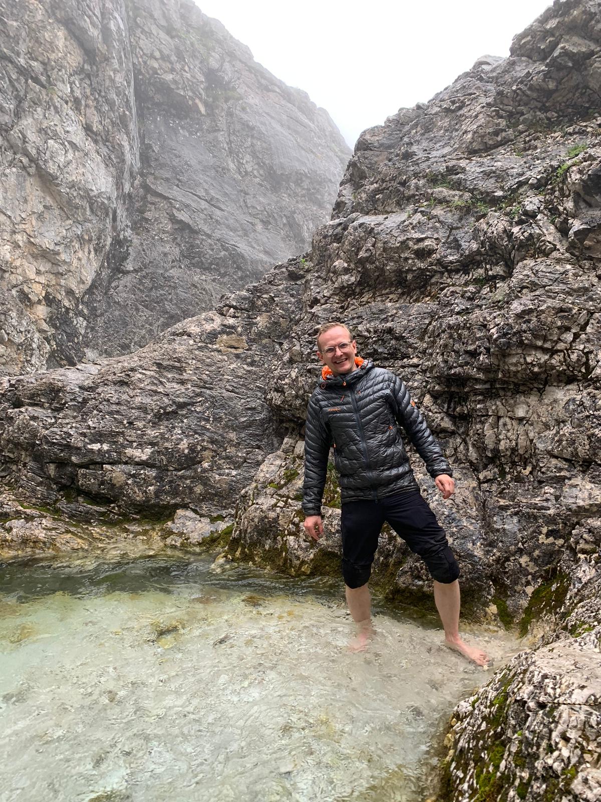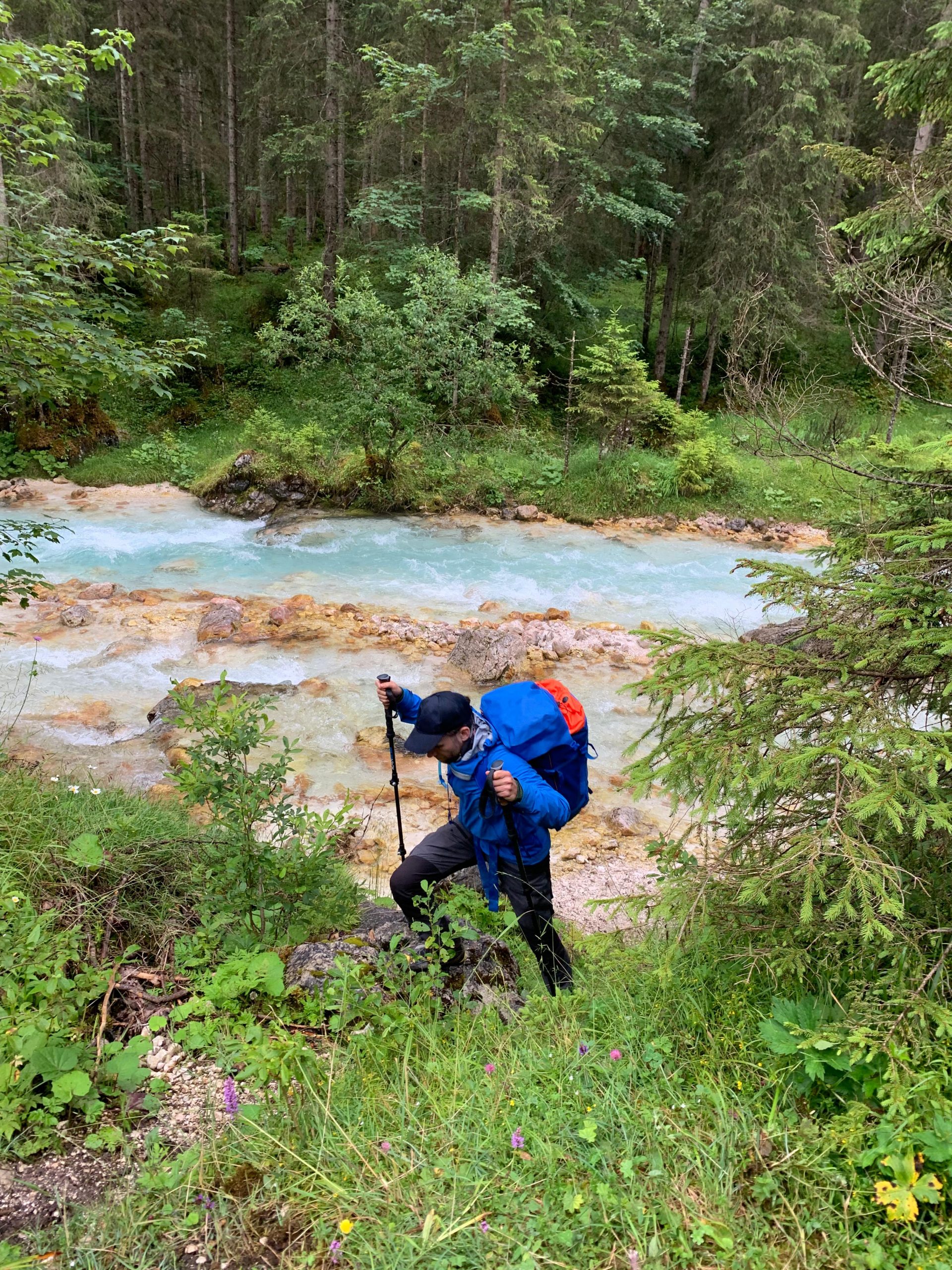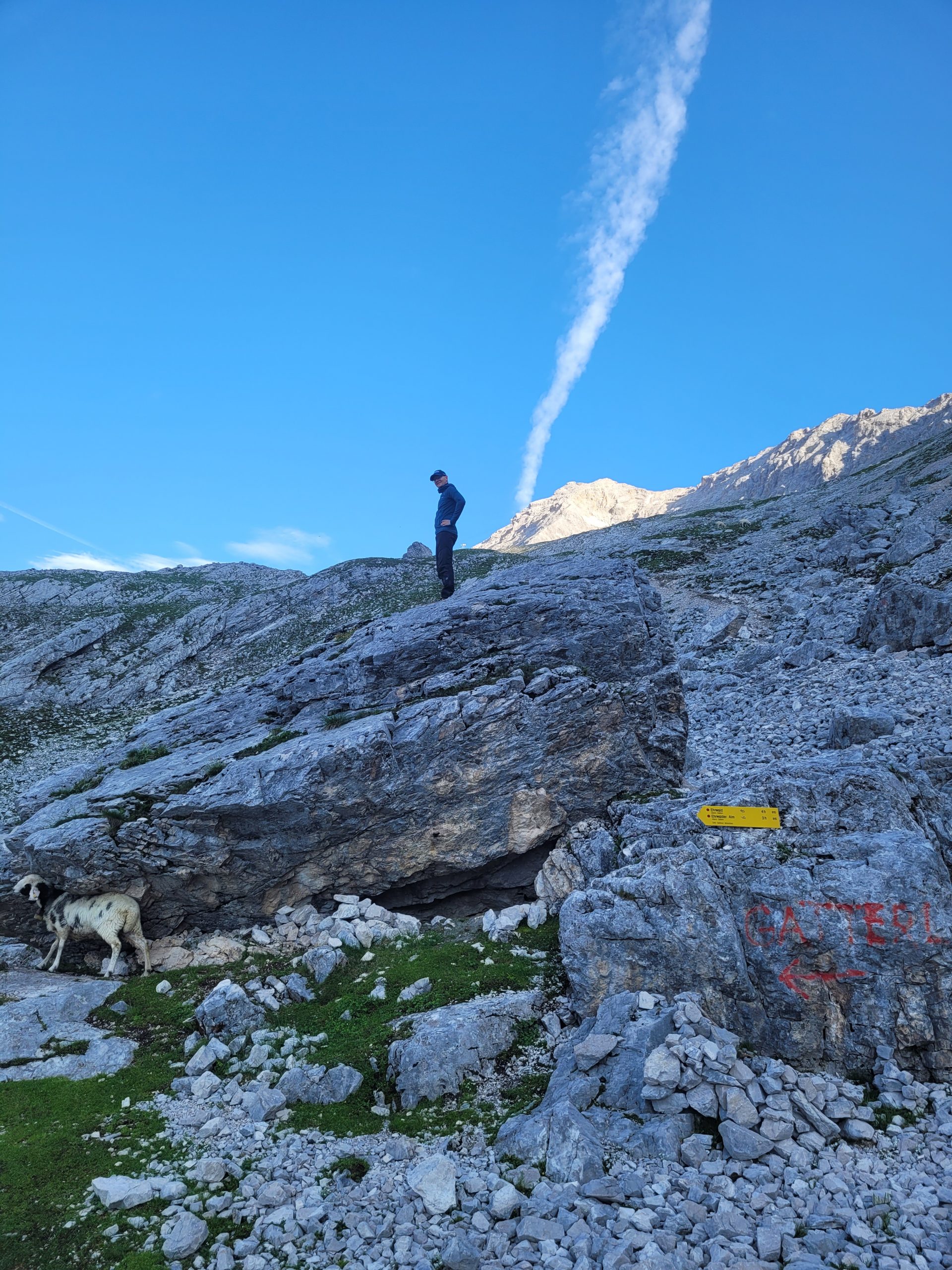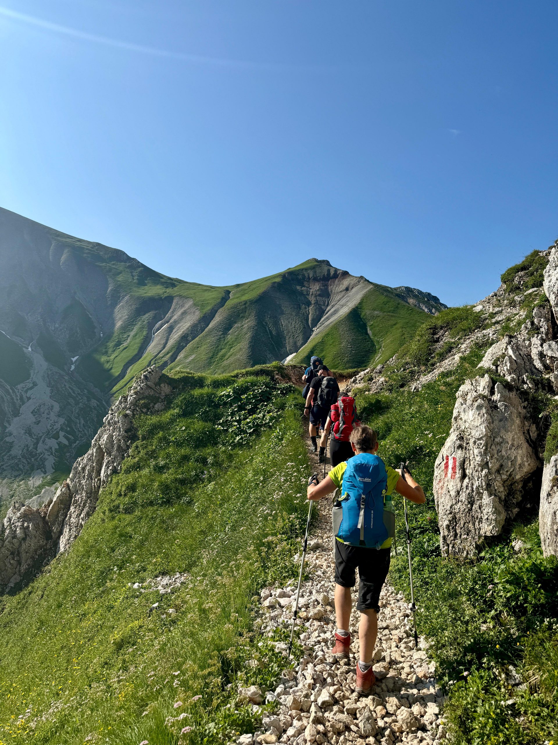 Wir starten unsere viertägige Tour mit der Zugspitzbahn von Garmisch Partenkirchen nach Hammersbach und nutzen das Haltehäuschen direkt um die Regenklamotten überzuwerfen. Im mittel-leichten Regen geht es danach zur Höllentaleingangshütte und durch die beeindruckende Höllentalklamm, deren Erschließung für Wanderer maßgeblich von Adolf Zöppritz ab 1902 bis zur Fertigstellung 1905 vorangetrieben wurde. Aufgrund der Wetterlage sind wir dankbar für eine Einkehr in der neuen Höllentalangerhütte (1387 m), wo wir ausgiebig speisen sowie trinken und die Zeit auch gleich für eine amüsante Vorstellungsrunde nutzen. Es geht bei wechselhaftem Wetter zu Fuß weiter über die Knappenhäuser (1526 m) an den deutschen Molybdänstollen zum Hupfleitenjoch (1750 m). Von dort genießen wir dank deutlich verbessertem Wetter einen spektakulären Blick zurück ins Höllental und auf die Hauptgipfel des Wettersteinmassivs. Deutlich beschwingt gehen wir weiter zum Adolf Zöppritz Haus bzw. Kreuzeckhaus (1850 m) und lassen uns bei Kaffee und Kuchen die Klamotten von der Sonne trocknen.