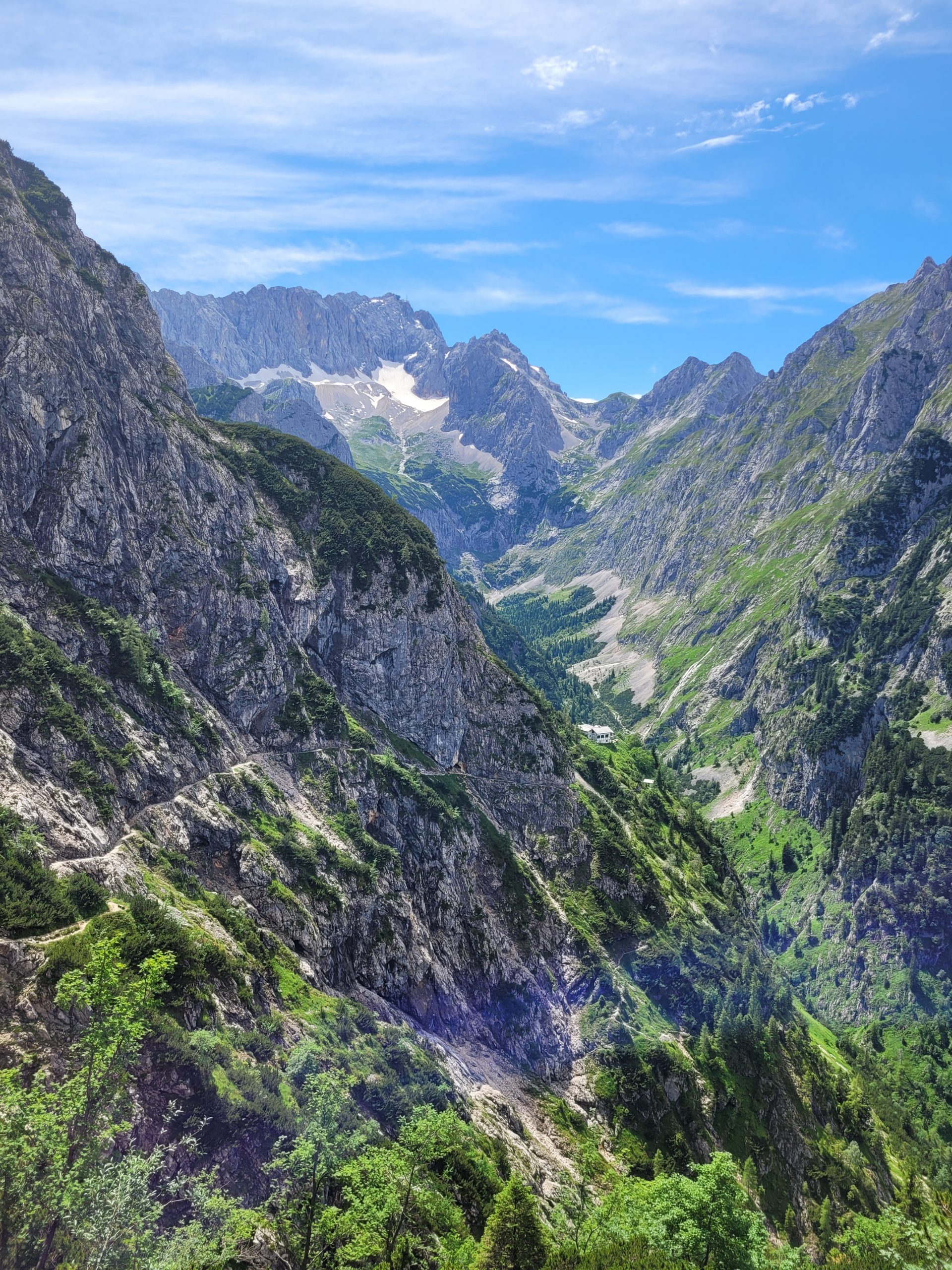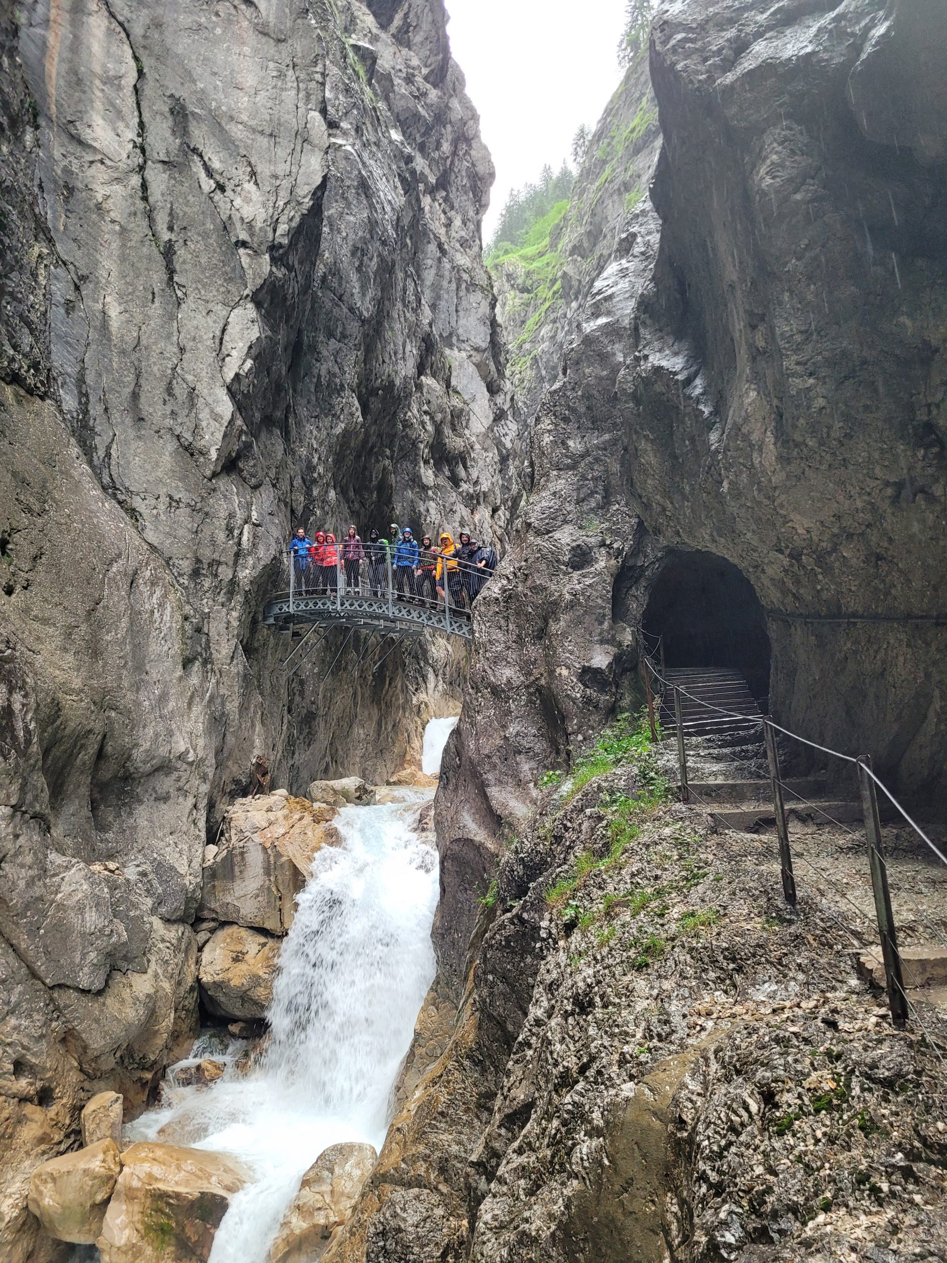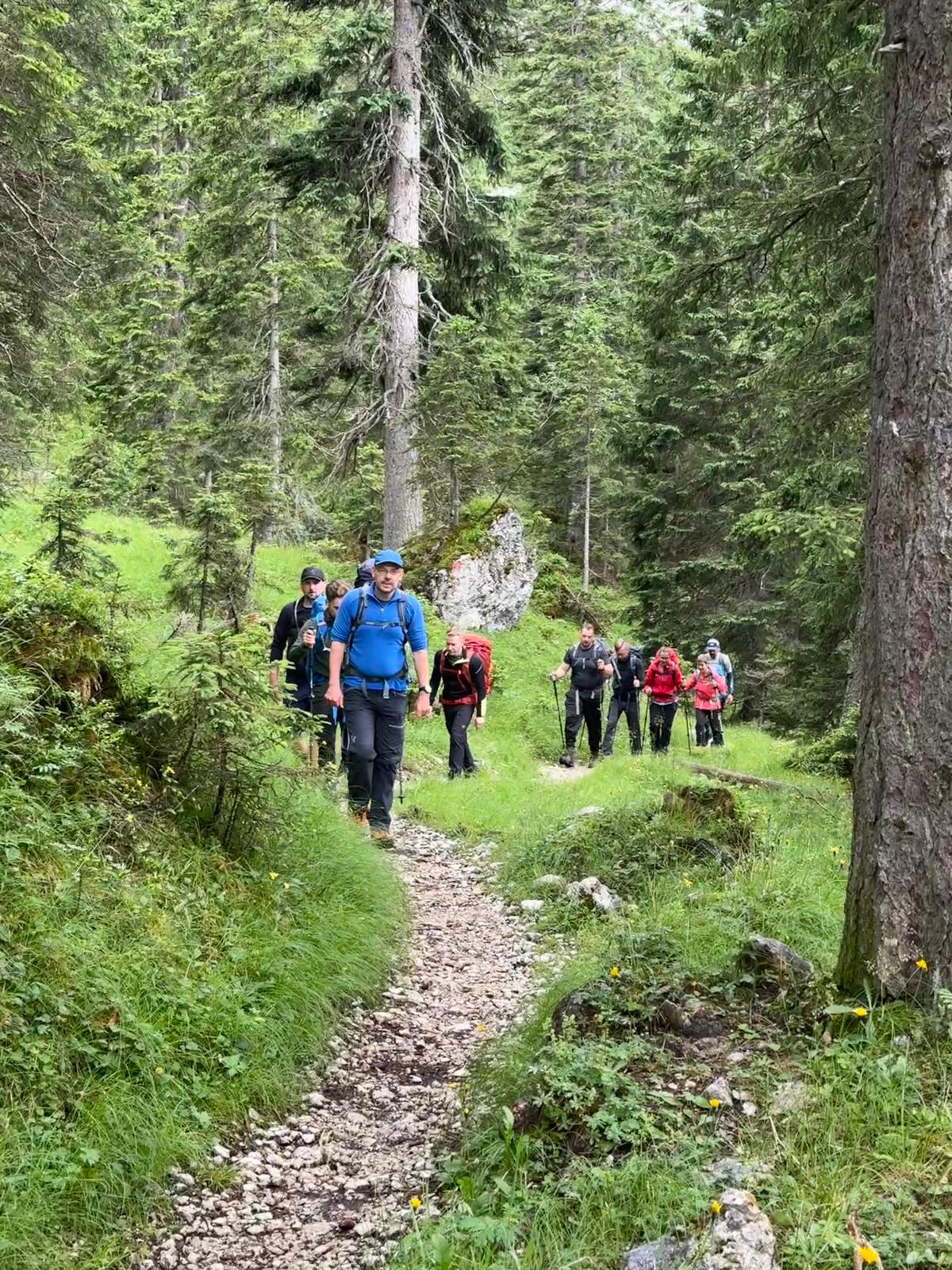 Der zweite Tag beginnt mit einem phänomenalen Wolkenwechselspiel und so treten wir nach gründlicher Aufwärmphase den Weg über den Bernadeinsteig an. Auf diesem Abschnitt fühlt man sich durch die endlosen Nadelwälder am Fuße der Stuiben- und Bernadeinwände besonders weit von der Zivilisation entfernt. Wir kehren für eine kurze Stärkung an der Bockhütte (1052 m) ein und gehen danach an der Partnach entlang in prächtiger Natur bis zur Reintalangerhütte (1369 m). Neben dem großartigen Kuchenangebot, werden wir auch abends kulinarisch durch eine exzellente Küchenleistung verwöhnt. Herzlichen Dank an das gesamte Team vor Ort!