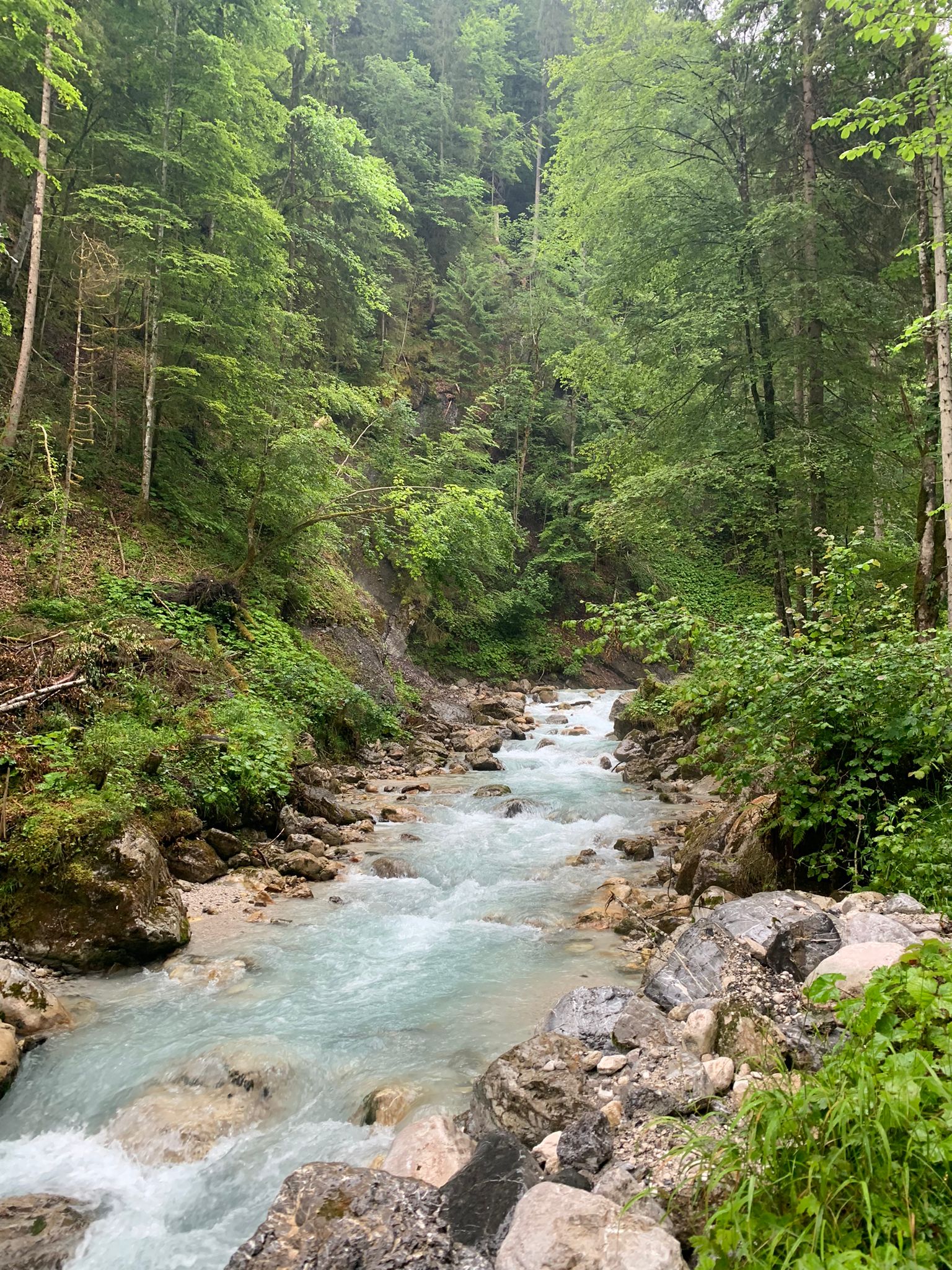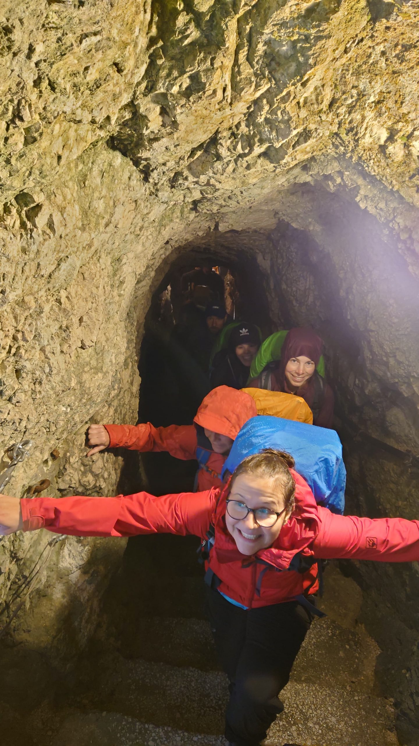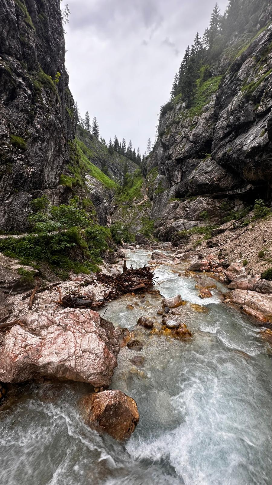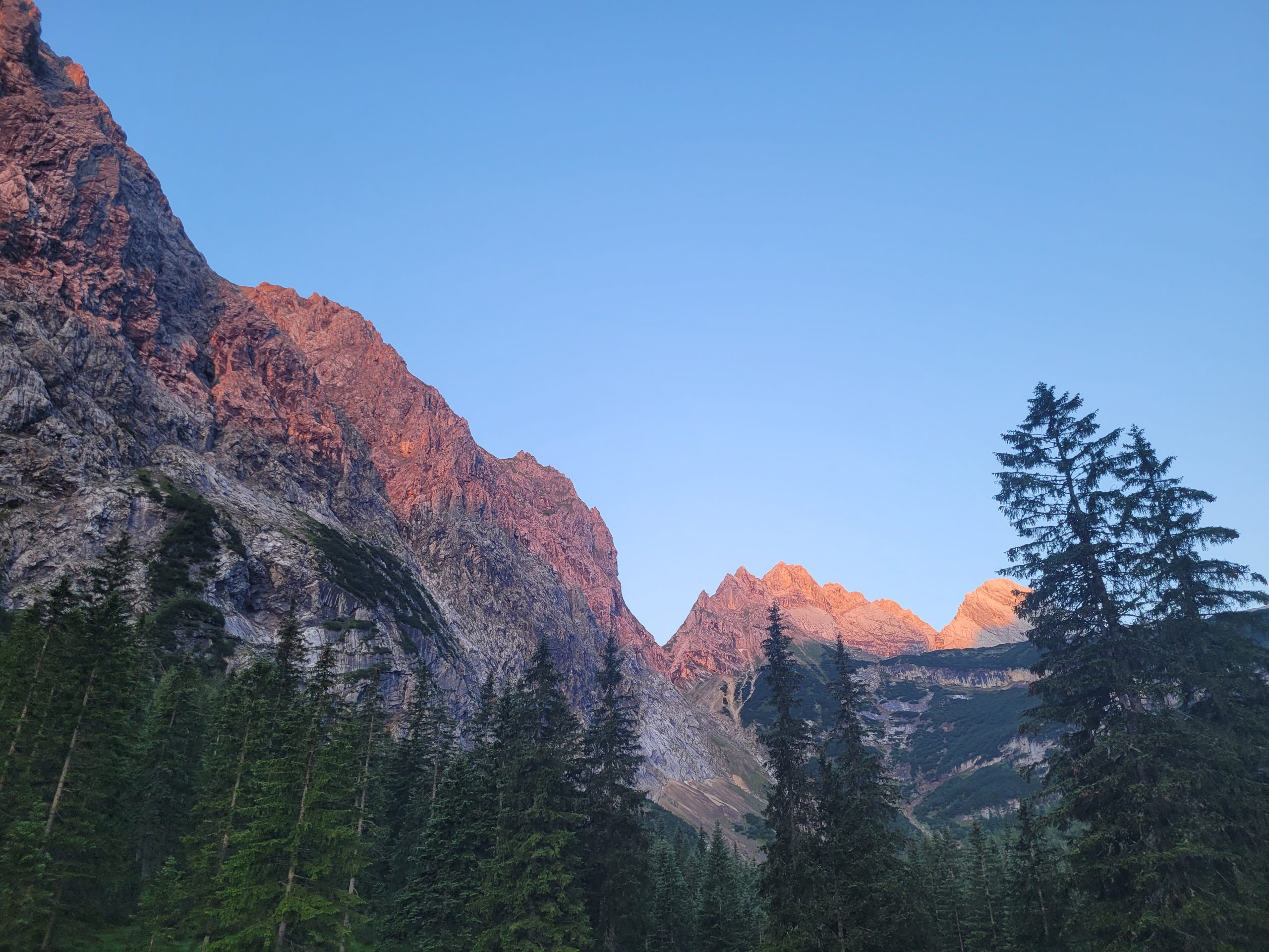 Der zweite Tag beginnt mit einem phänomenalen Wolkenwechselspiel und so treten wir nach gründlicher Aufwärmphase den Weg über den Bernadeinsteig an. Auf diesem Abschnitt fühlt man sich durch die endlosen Nadelwälder am Fuße der Stuiben- und Bernadeinwände besonders weit von der Zivilisation entfernt. Wir kehren für eine kurze Stärkung an der Bockhütte (1052 m) ein und gehen danach an der Partnach entlang in prächtiger Natur bis zur Reintalangerhütte (1369 m). Neben dem großartigen Kuchenangebot, werden wir auch abends kulinarisch durch eine exzellente Küchenleistung verwöhnt. Herzlichen Dank an das gesamte Team vor Ort!
