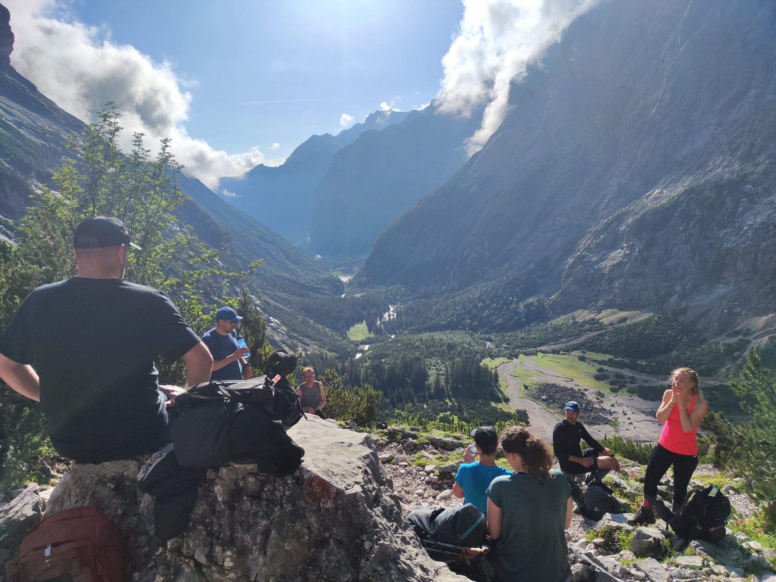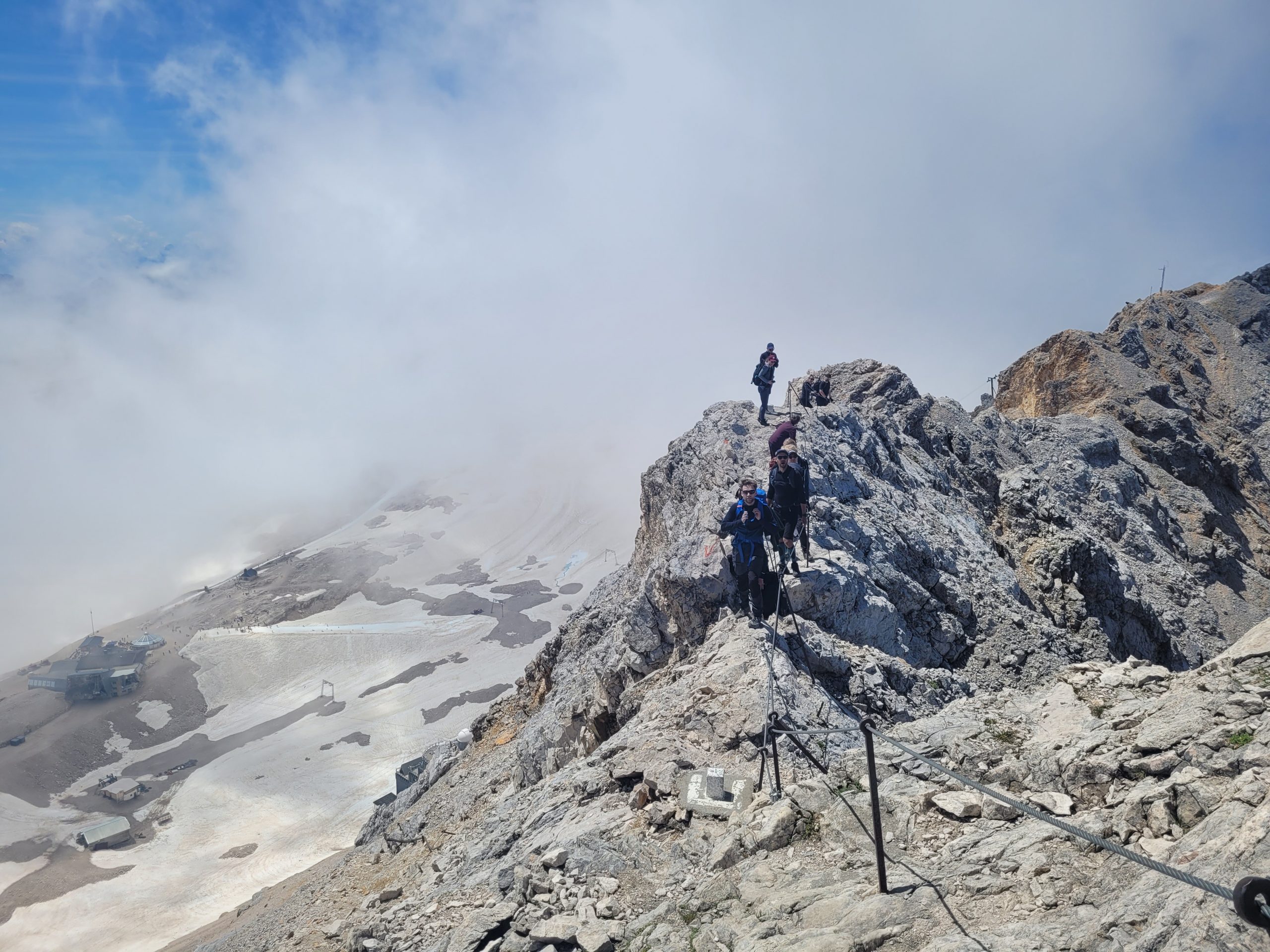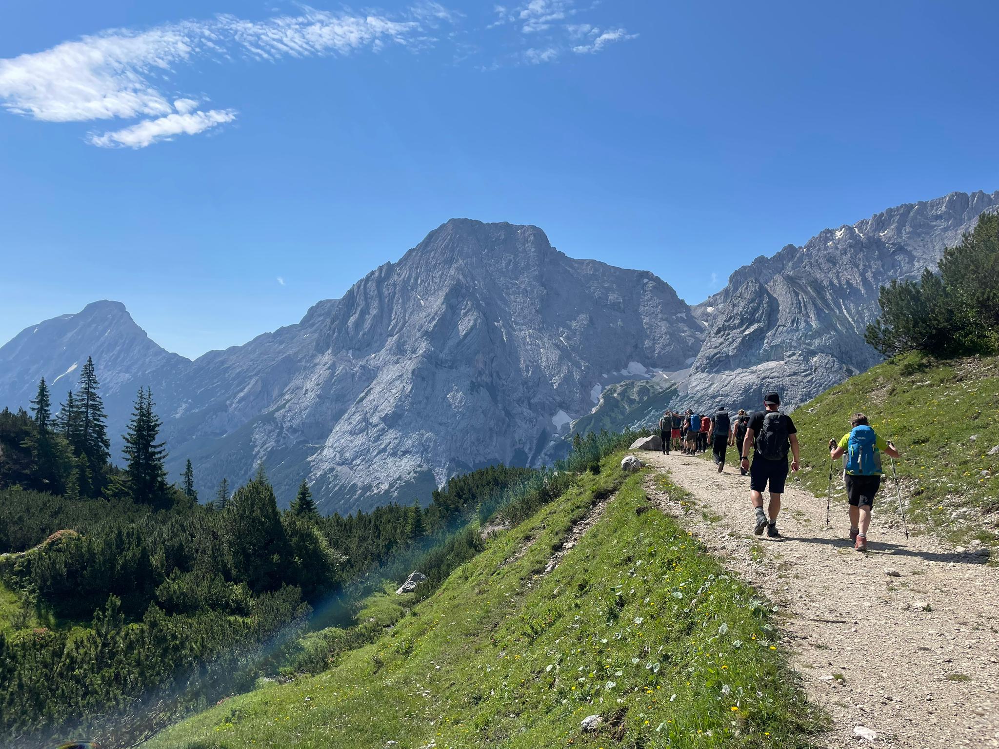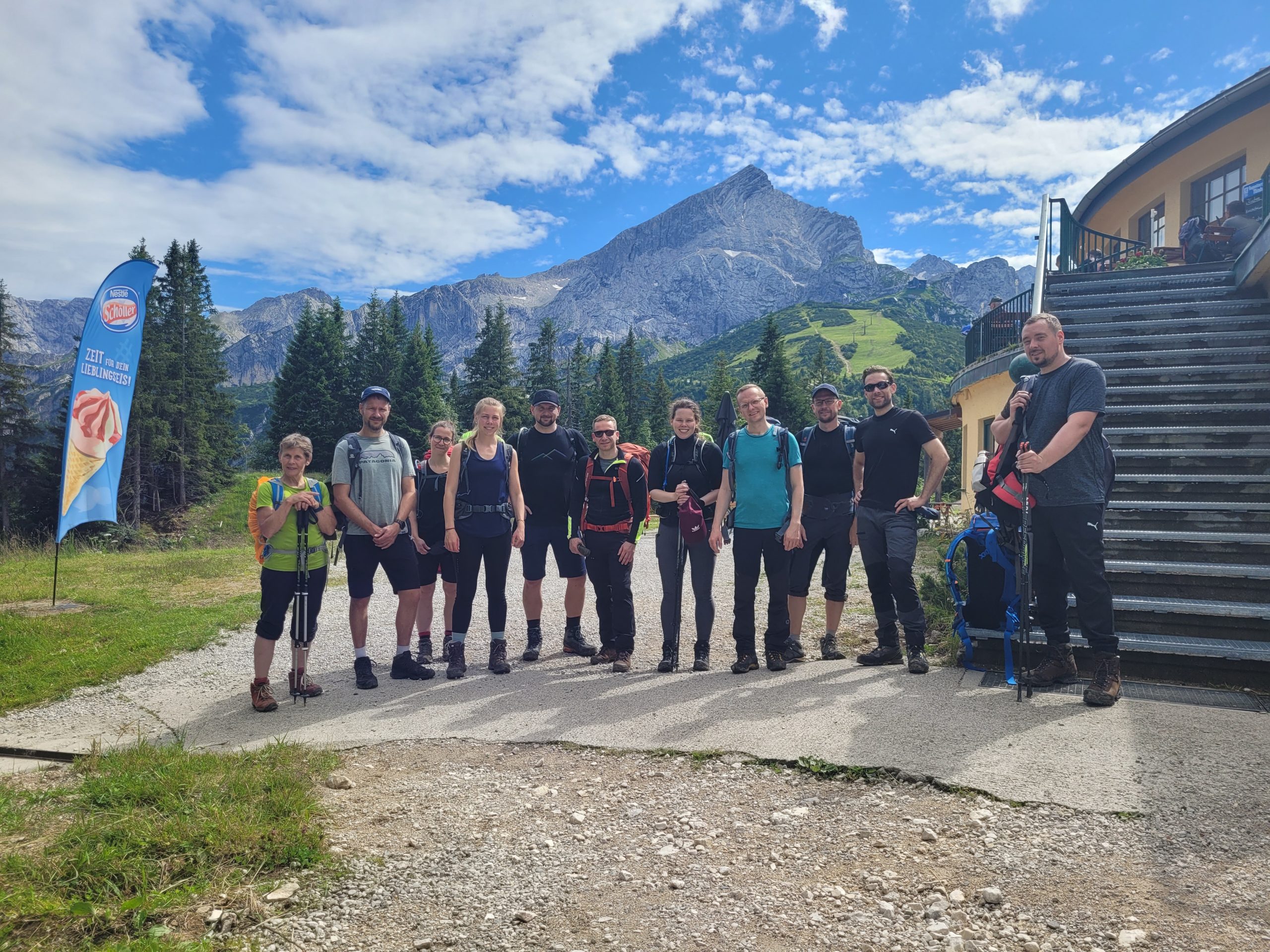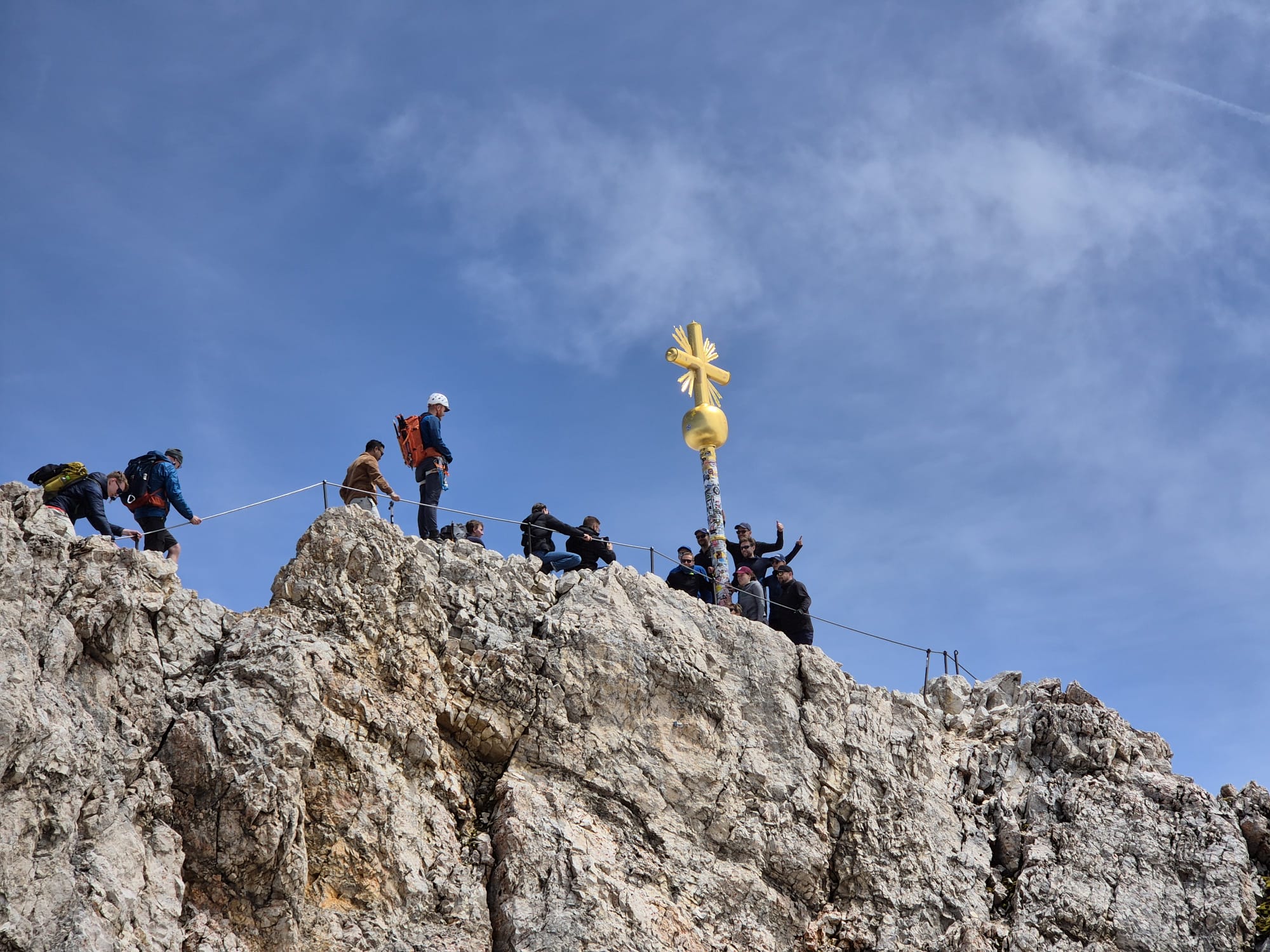 Nach der Gruppenerwärmung starten wir unsere Tour über das Gatterl und haben noch einmal richtig gutes Wetter erwischt. Wir kehren noch kurz am Tirolerhaus ein, bevor es dann mit Seilbahn und später mit der Eisenbahn zurück zum Ausgangspunkt in Garmisch-Partenkirchen geht.