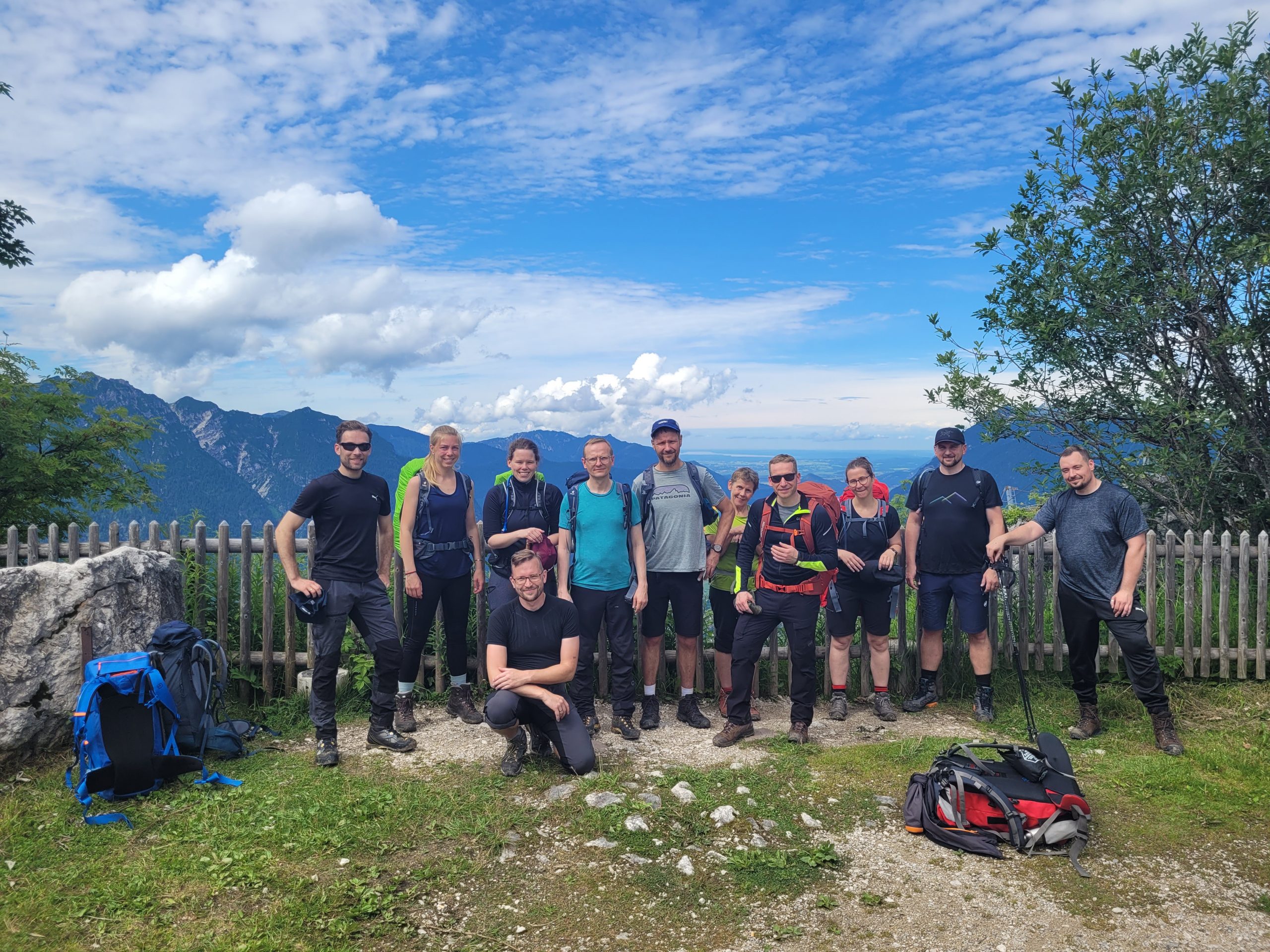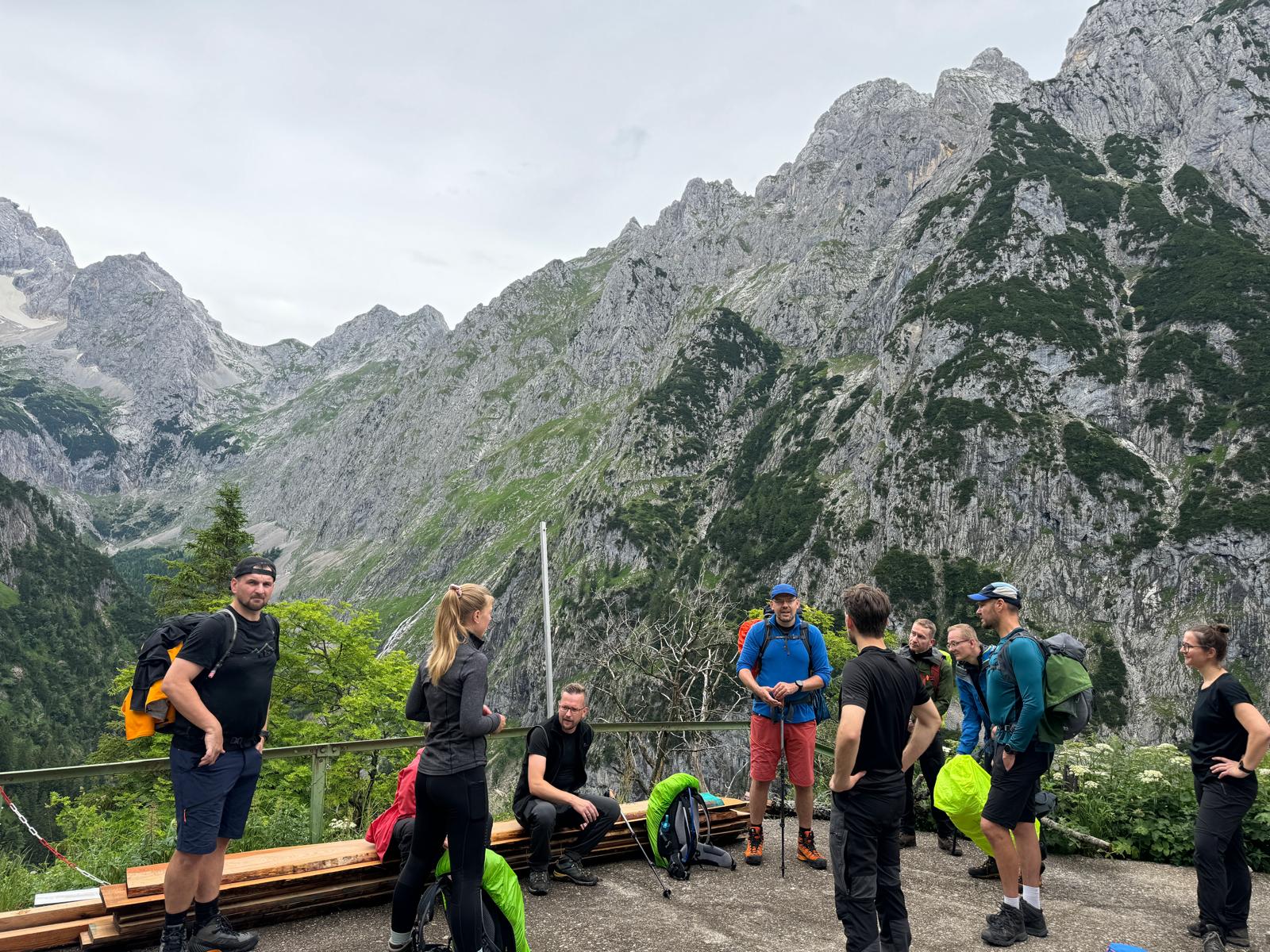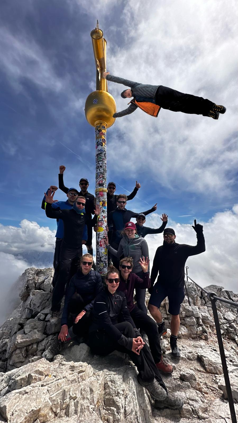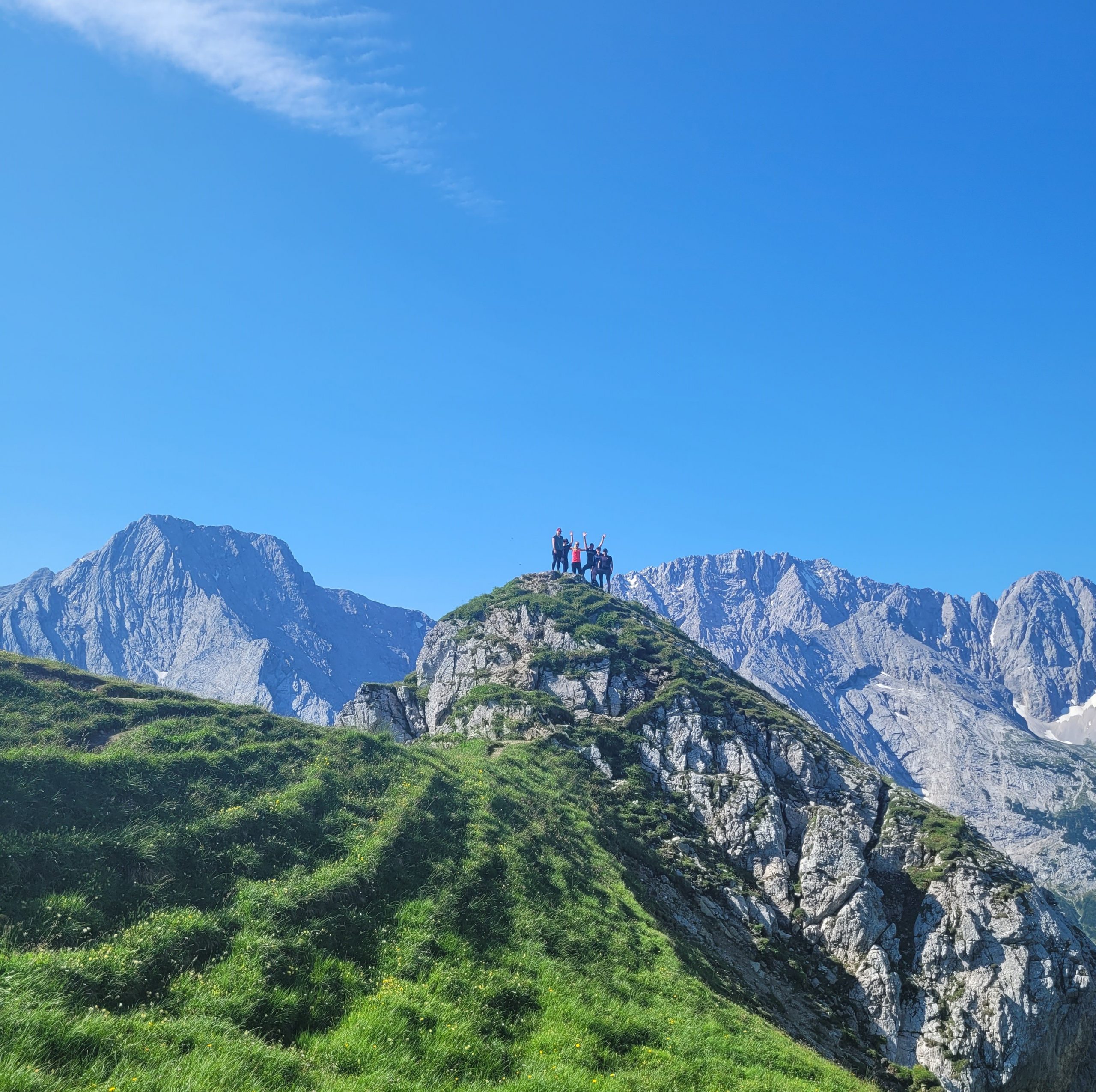 Nach der Gruppenerwärmung starten wir unsere Tour über das Gatterl und haben noch einmal richtig gutes Wetter erwischt. Wir kehren noch kurz am Tirolerhaus ein, bevor es dann mit Seilbahn und später mit der Eisenbahn zurück zum Ausgangspunkt in Garmisch-Partenkirchen geht.
