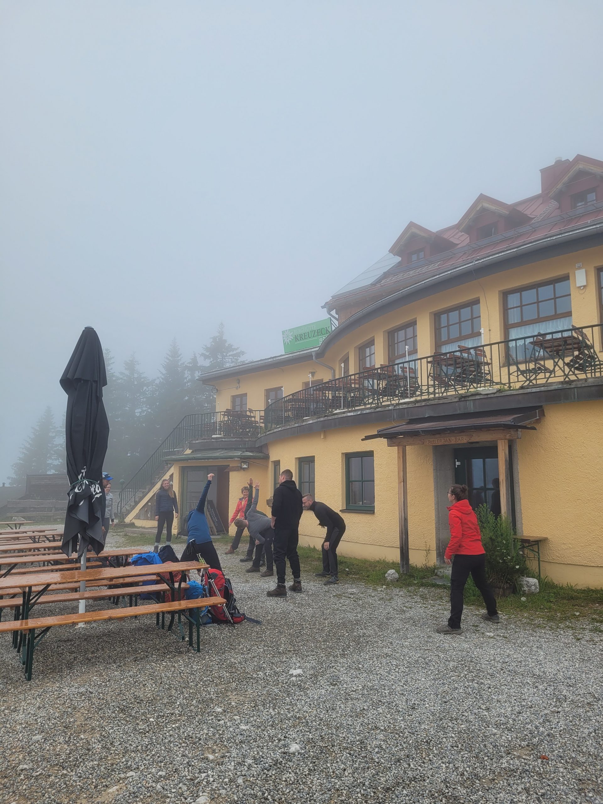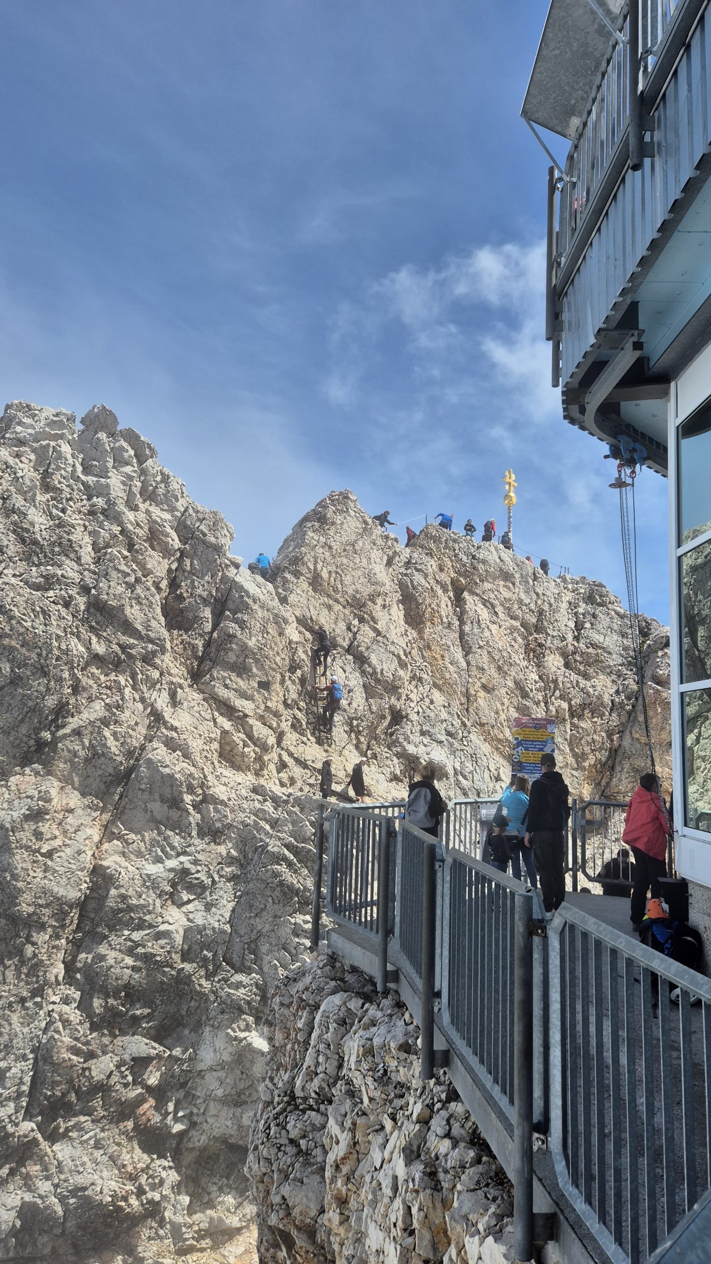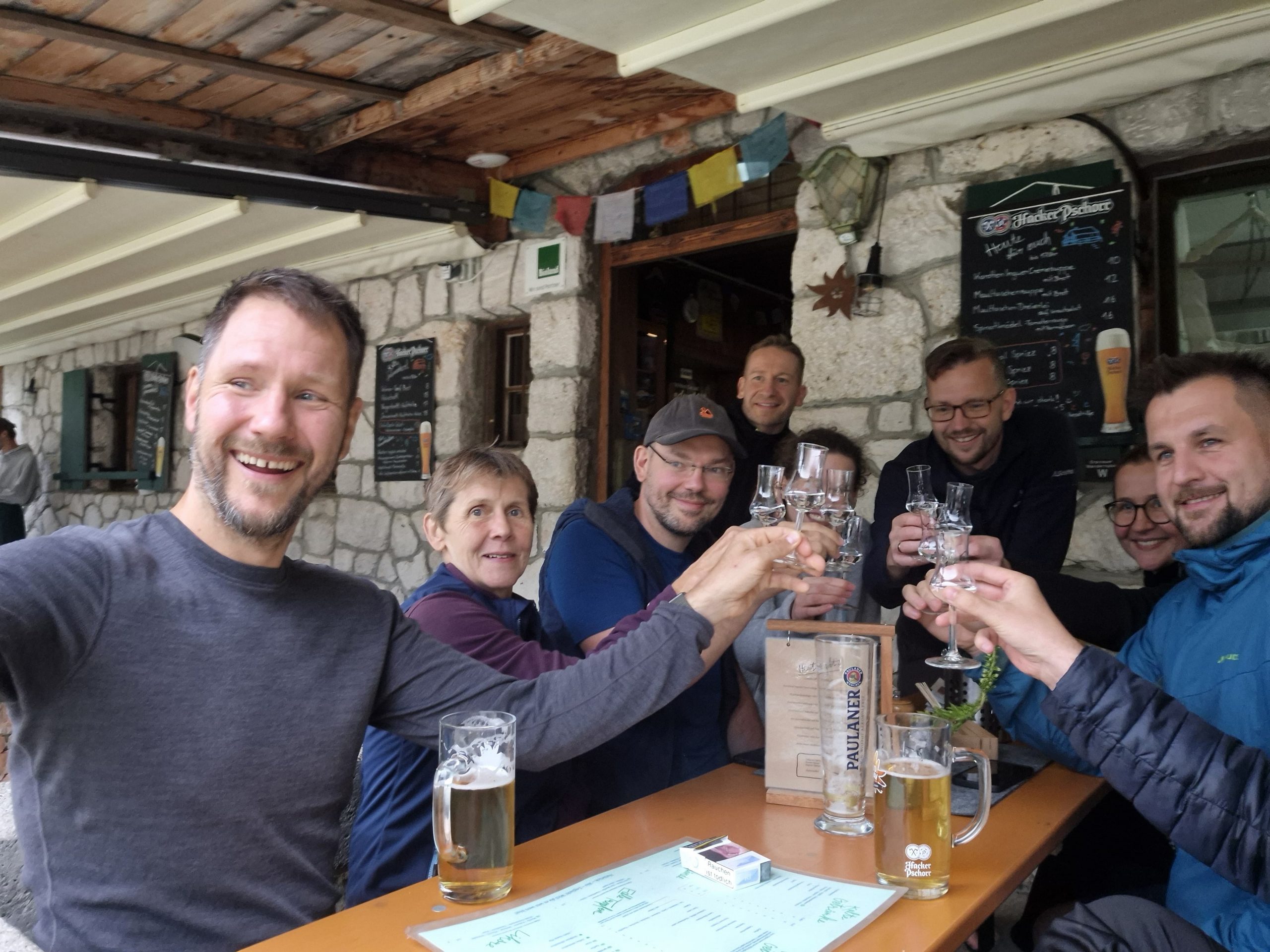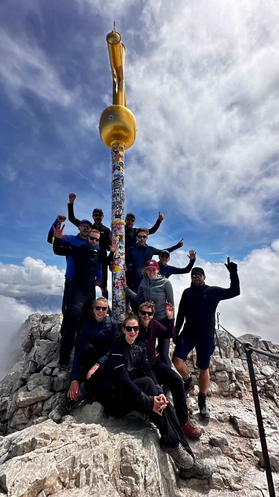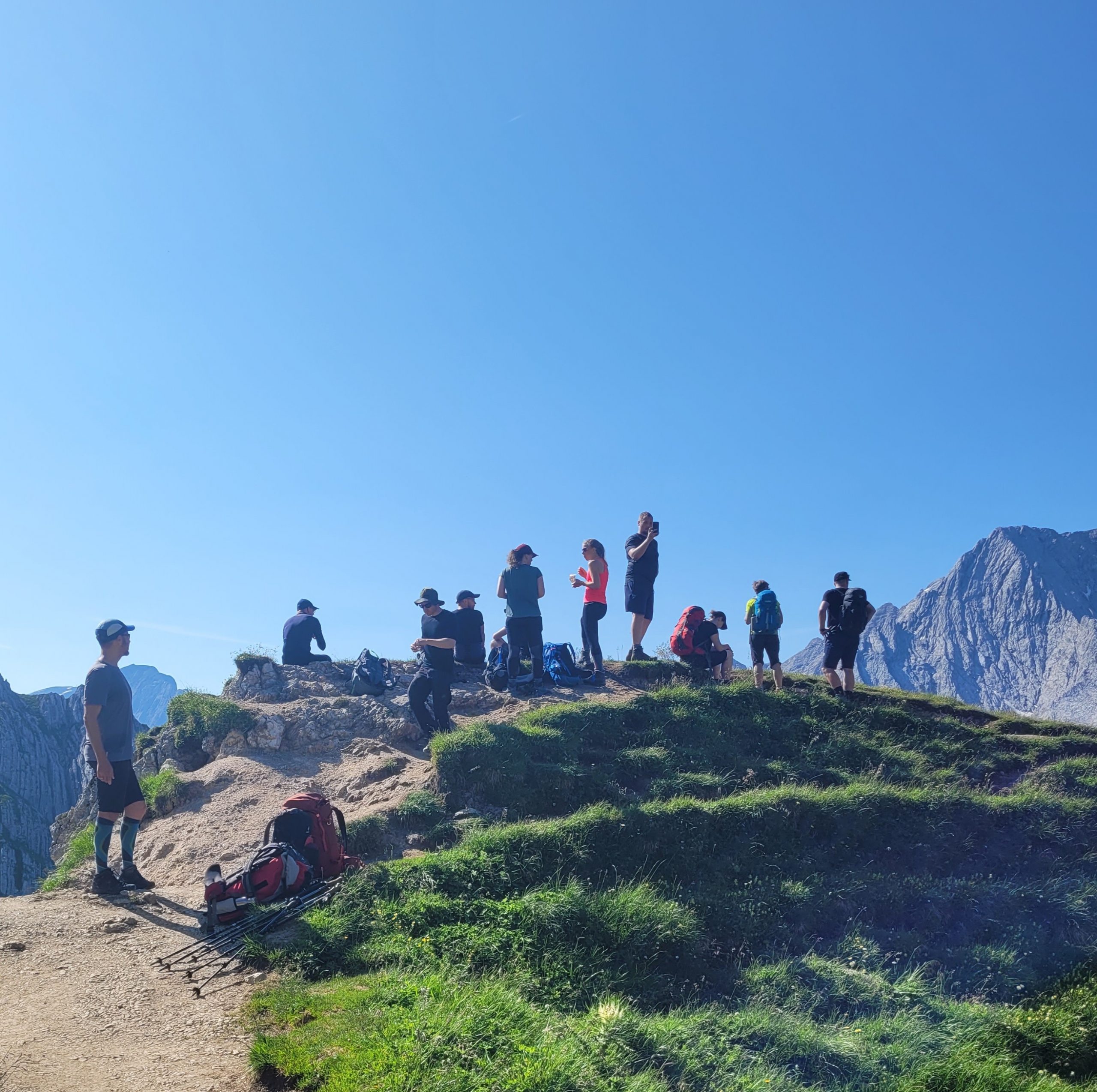 Nach der Gruppenerwärmung starten wir unsere Tour über das Gatterl und haben noch einmal richtig gutes Wetter erwischt. Wir kehren noch kurz am Tirolerhaus ein, bevor es dann mit Seilbahn und später mit der Eisenbahn zurück zum Ausgangspunkt in Garmisch-Partenkirchen geht.