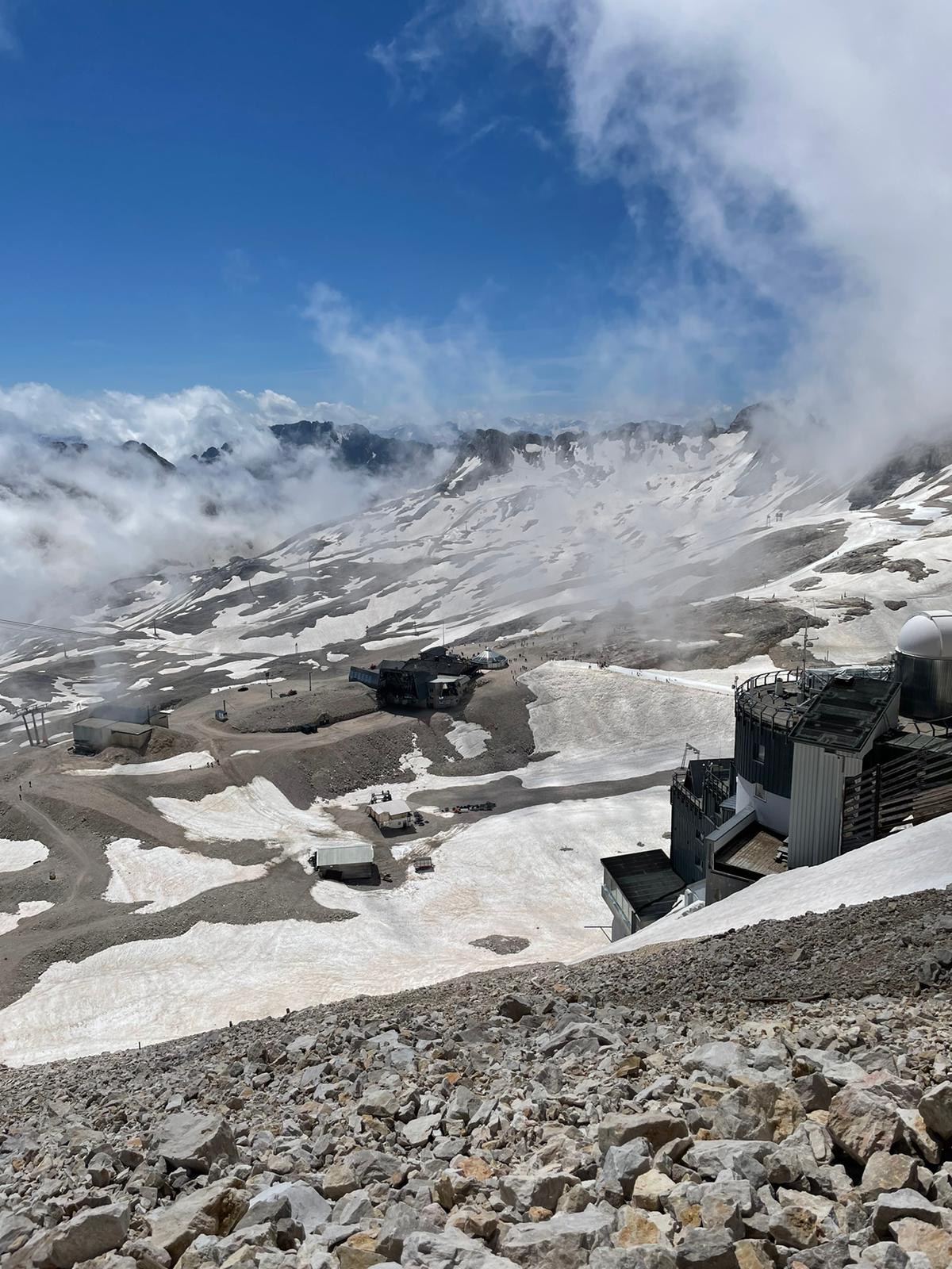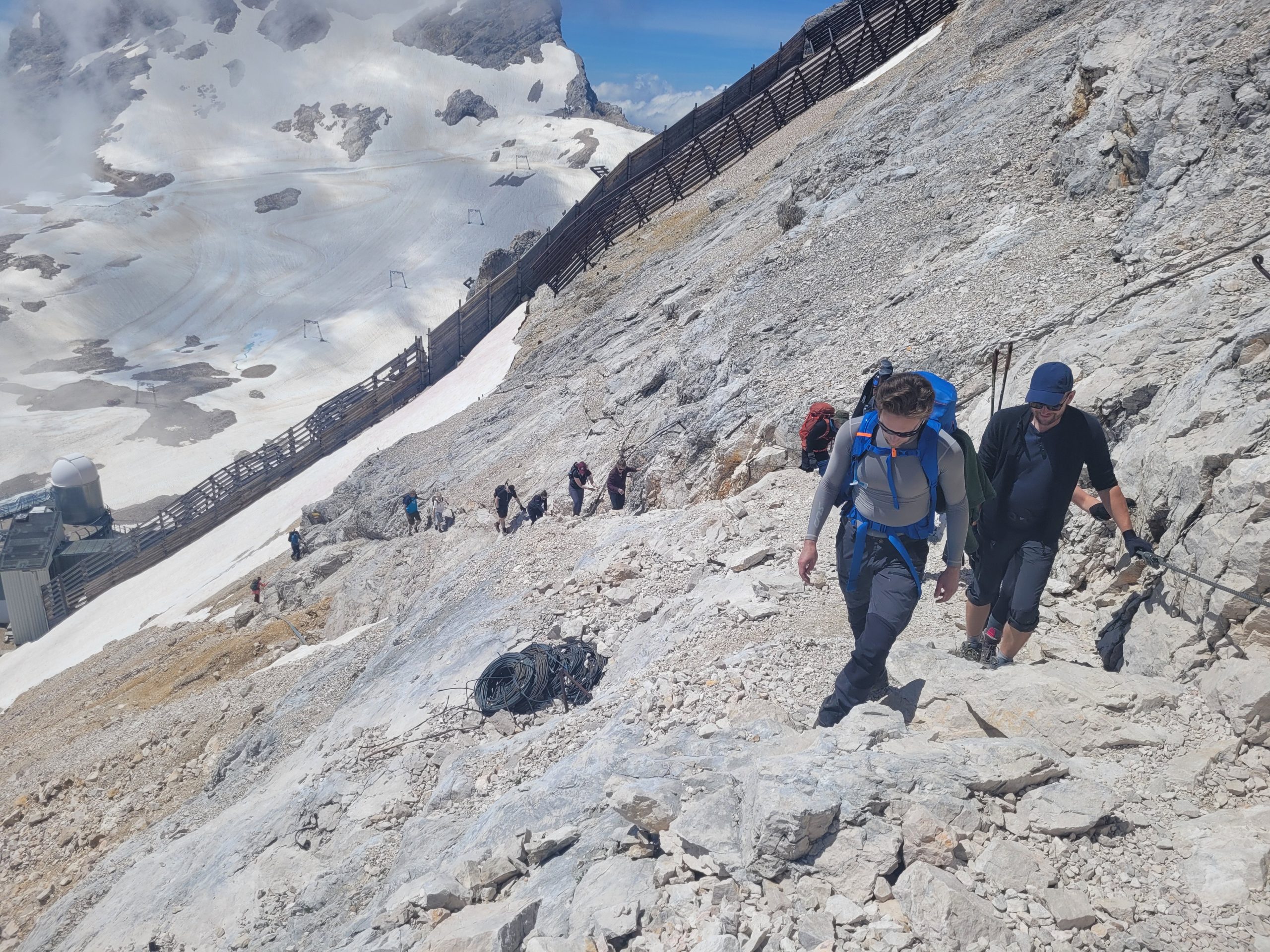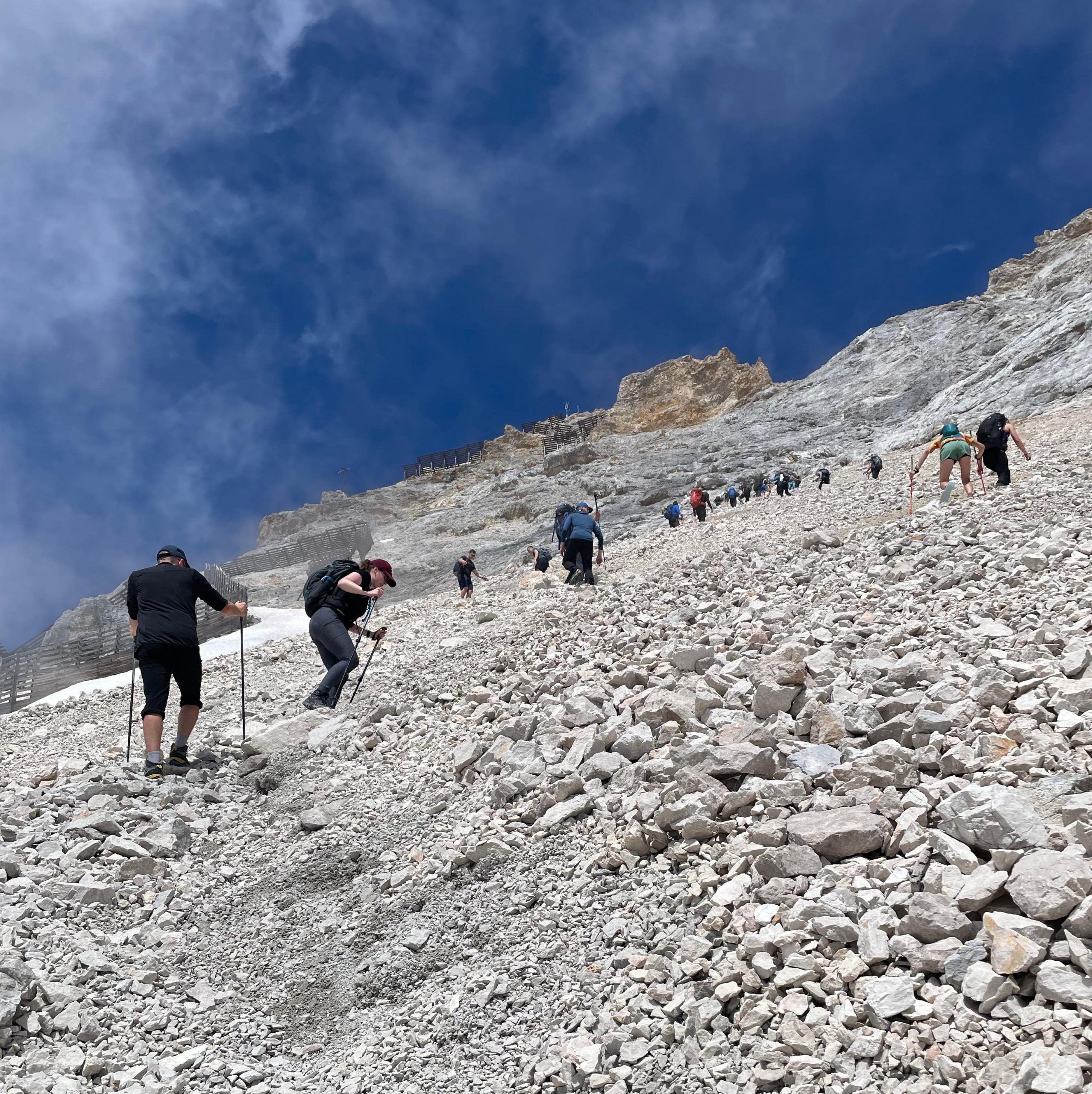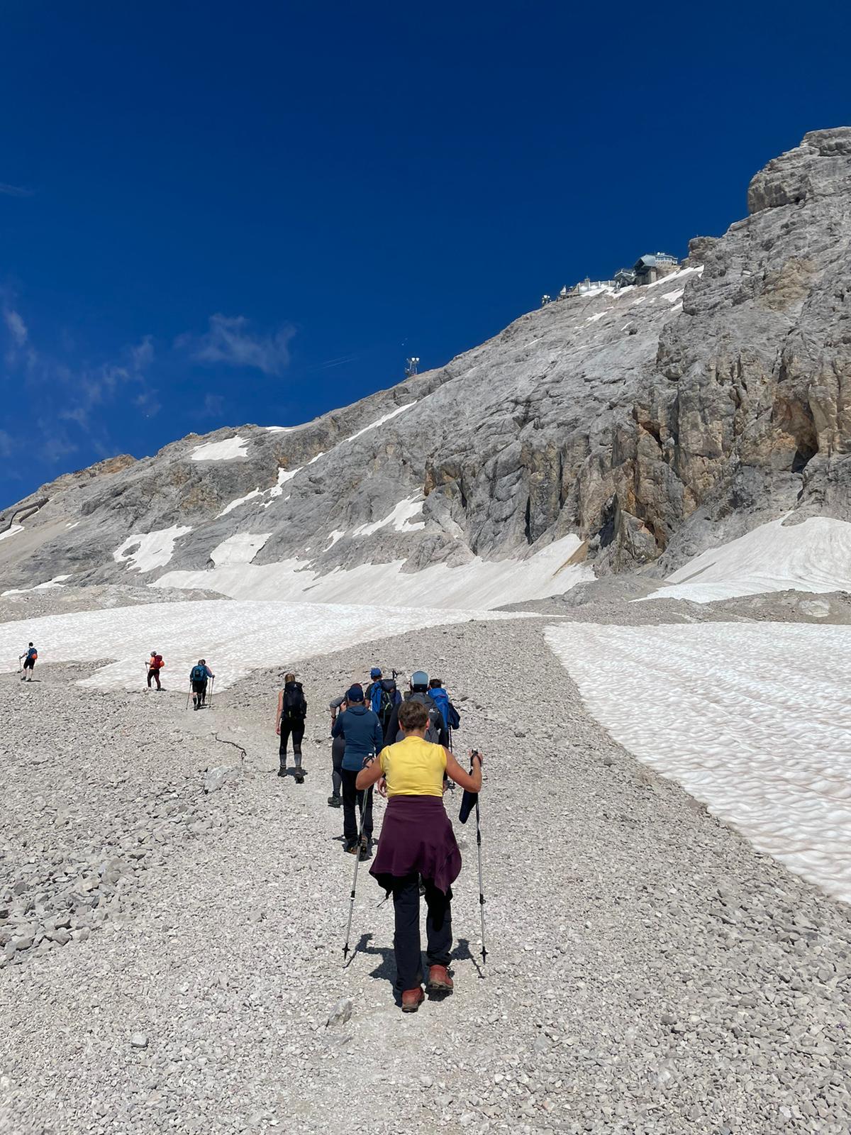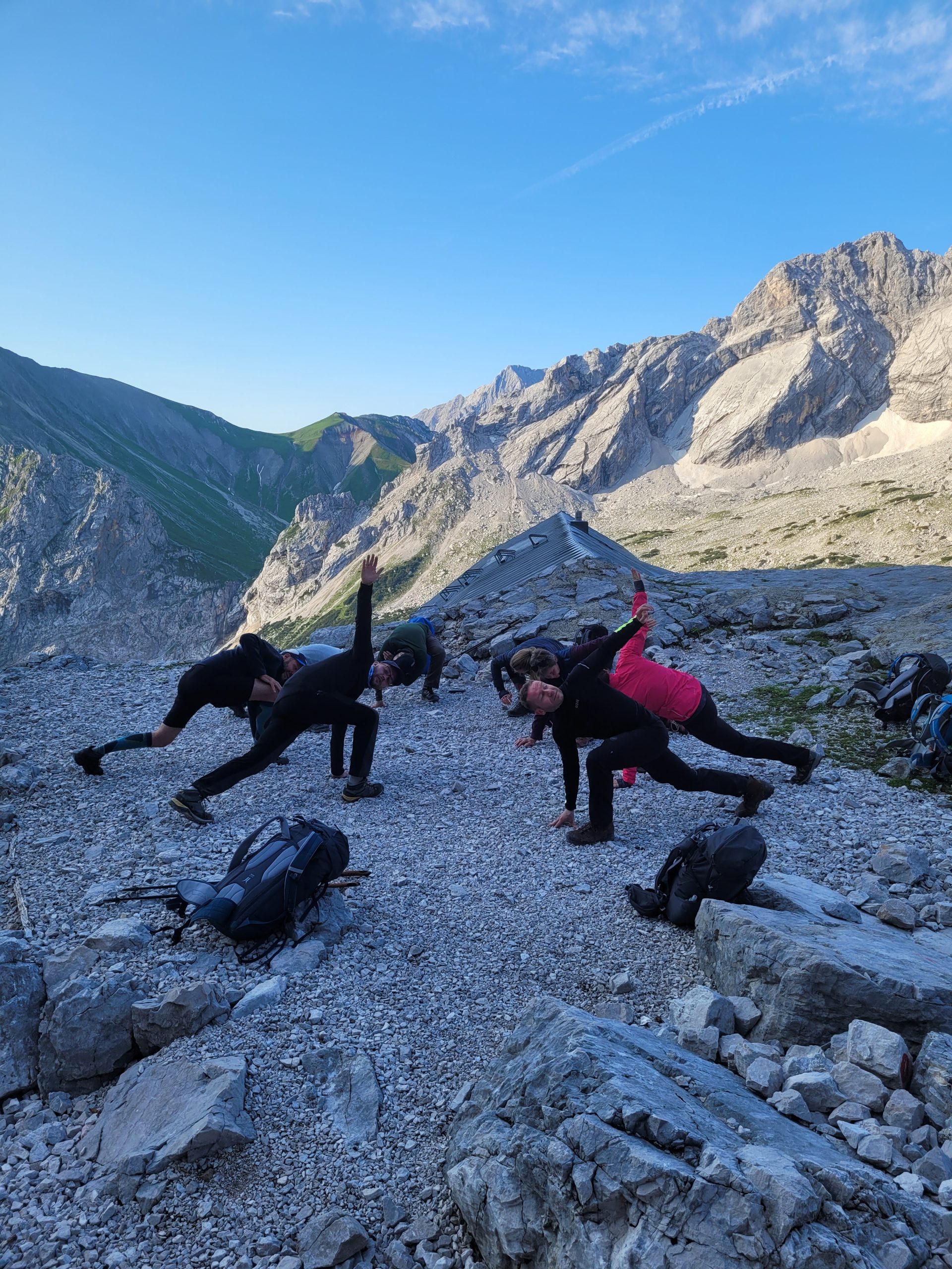 Wir starten zeitig mit den rot angestrahlten Gipfeln des Wettersteinmassivs und arbeiten uns Schritt für Schritt zur Knorrhütte (2051 m) herauf, wo wir rehydrieren und Gepäck ablegen, sodass wir den weiteren Weg über die Mondlandschaft leichtgewichtig angehen können. Wir arbeiten uns durch hartnäckige Schneefelder und arbeitsintensive Geröllabschnitte bis zur drahtseilversicherten Passage oberhalb des Schneefernerhauses herauf. Für das Gruppenbild am Gipfel der Zugspitze (2962 m) stehen wir nach unseren 1600 Aufstiegshöhenmetern gemeinsam mit unzähligen Seilbahnfahrern an. Wir erleichtern uns den Abstieg mit der Gletscherseilbahn und feiern unseren Gipfelsieg an der Zugspitze mit allerlei flüssigen Leckereien. Herzlichen Glückwunsch an alle Gäste für diese großartige Leistung!