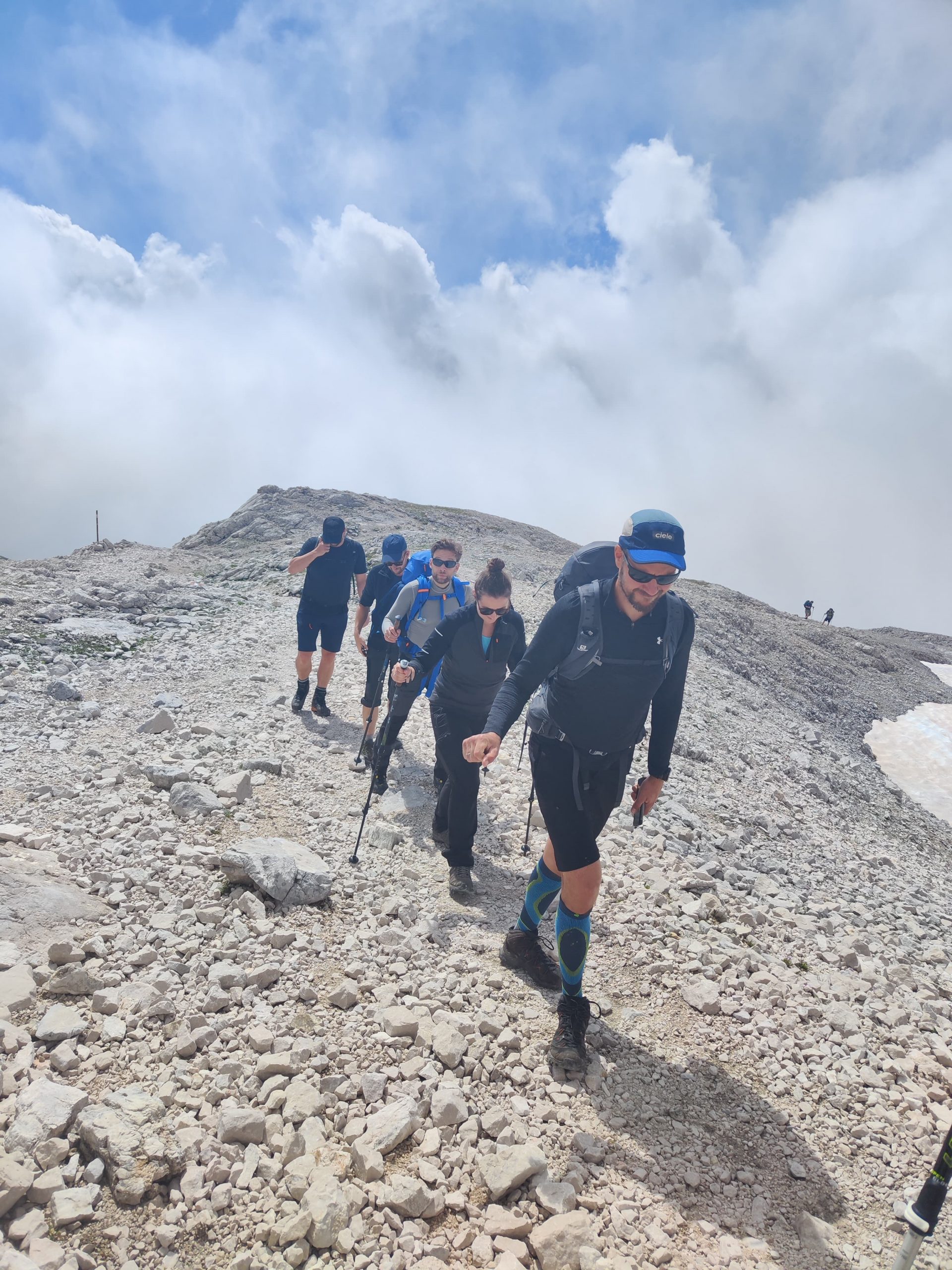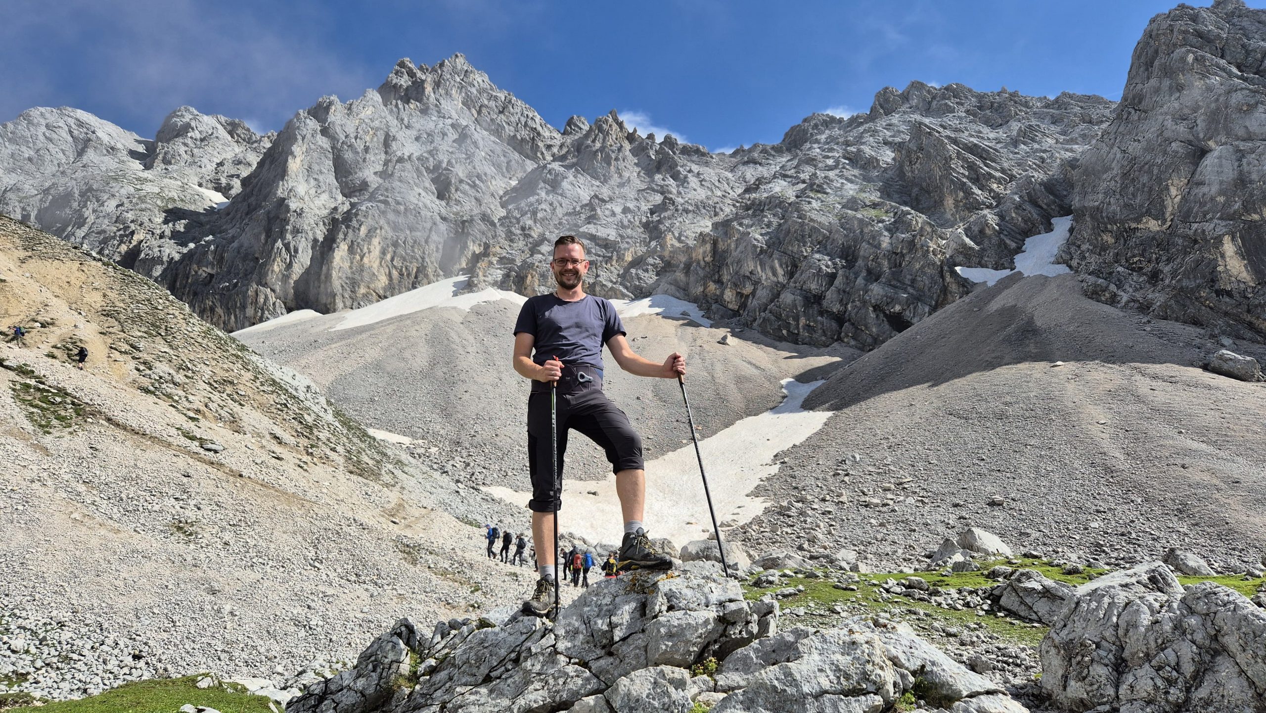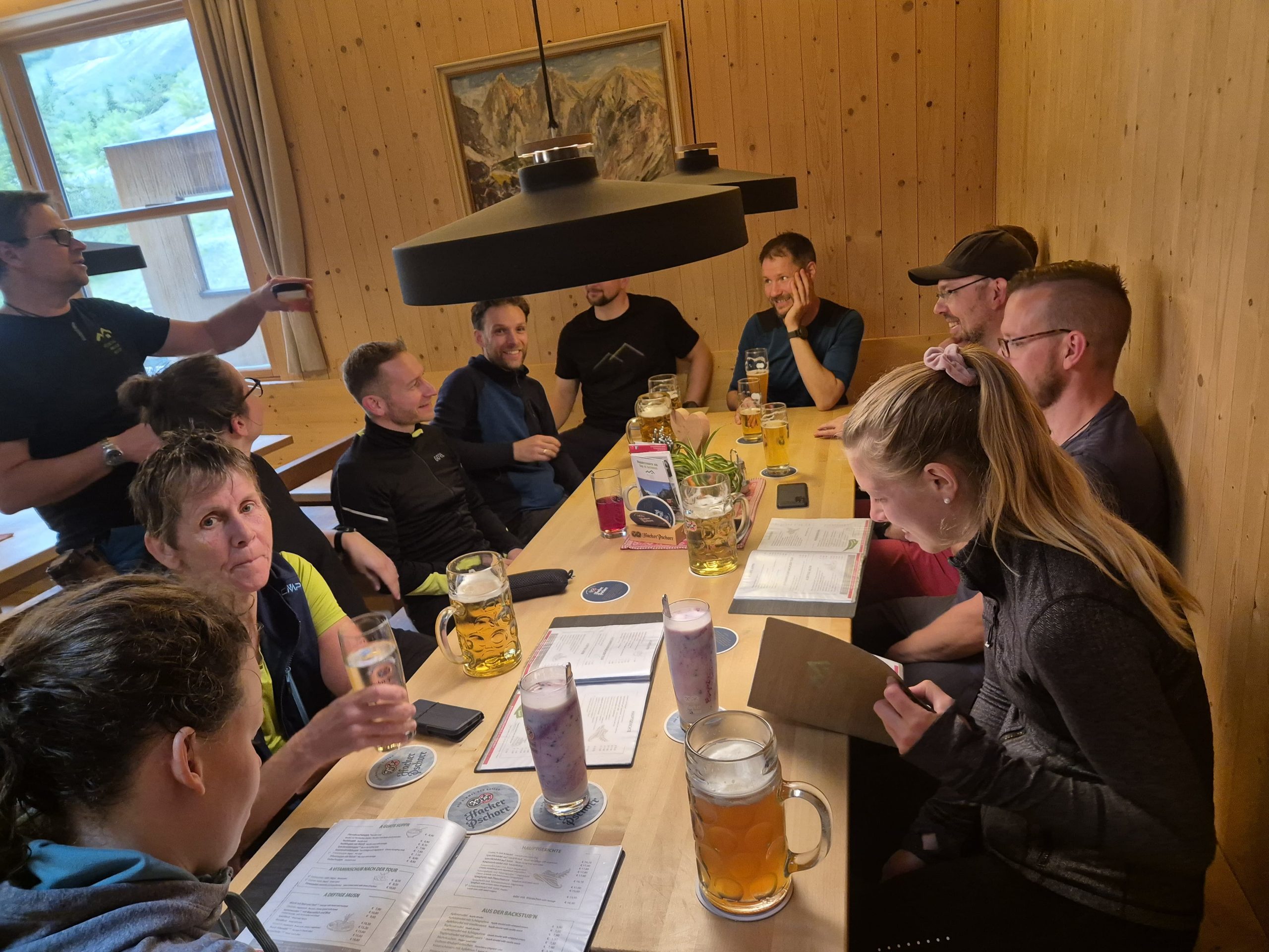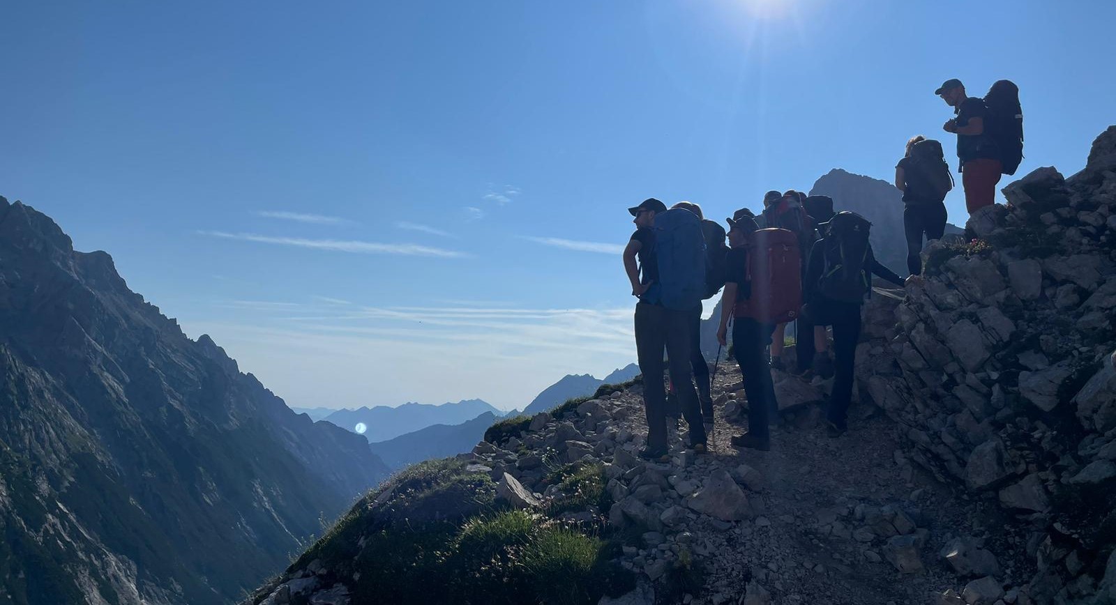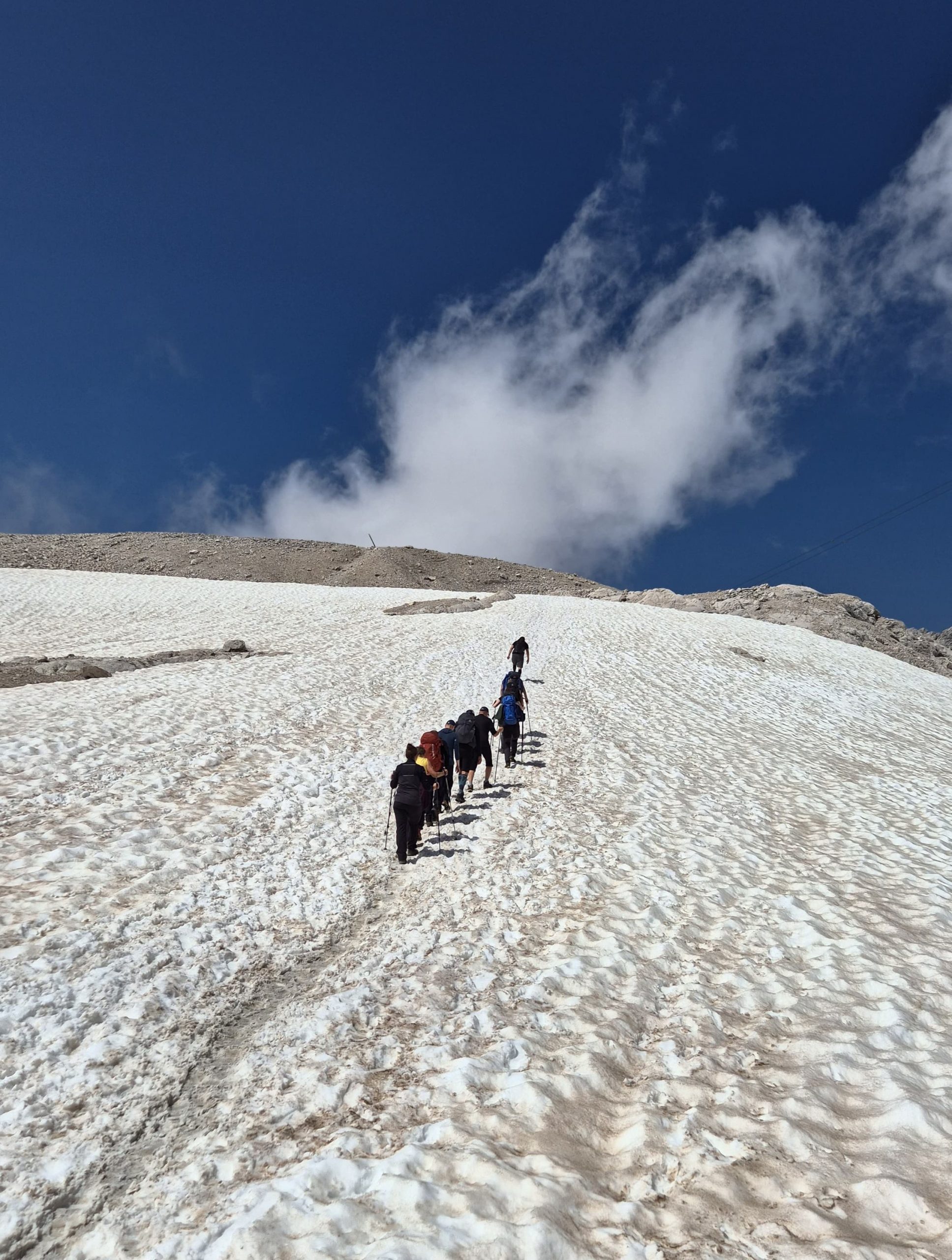 Wir starten zeitig mit den rot angestrahlten Gipfeln des Wettersteinmassivs und arbeiten uns Schritt für Schritt zur Knorrhütte (2051 m) herauf, wo wir rehydrieren und Gepäck ablegen, sodass wir den weiteren Weg über die Mondlandschaft leichtgewichtig angehen können. Wir arbeiten uns durch hartnäckige Schneefelder und arbeitsintensive Geröllabschnitte bis zur drahtseilversicherten Passage oberhalb des Schneefernerhauses herauf. Für das Gruppenbild am Gipfel der Zugspitze (2962 m) stehen wir nach unseren 1600 Aufstiegshöhenmetern gemeinsam mit unzähligen Seilbahnfahrern an. Wir erleichtern uns den Abstieg mit der Gletscherseilbahn und feiern unseren Gipfelsieg an der Zugspitze mit allerlei flüssigen Leckereien. Herzlichen Glückwunsch an alle Gäste für diese großartige Leistung!